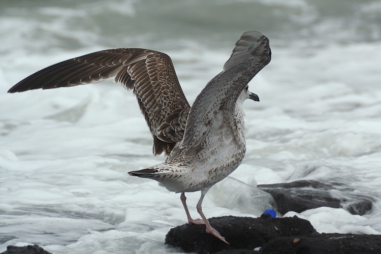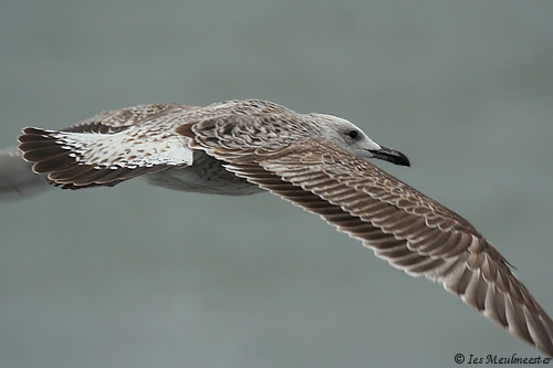 Larus cachinnans 1cy, October 01 2009, Westkapelle, the Netherlands. Picture: Ies Meulmeester. In all respects a typical and beautiful 1cy Caspian Gull. In the right wing note the median and some lesser coverts which are replaced by second generation feathers. Some characteristic features on this 1cy Caspian Gull are; the legs which are pale pinkish colored and especially long on the tibia, nearly all scapulars are replaced by second generation, which are dark grey colored with a narrow dark anchor and thin shaft streak, the juvenile wing-coverts are pale brownish and unmarked with only small white fringes, the inner greater coverts show broad white tips. On the third picture you see that most underwing-coverts are replaced by whitish feathers. |