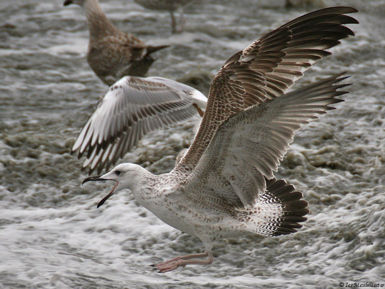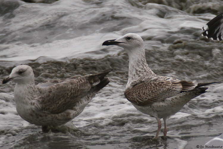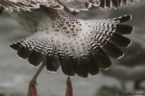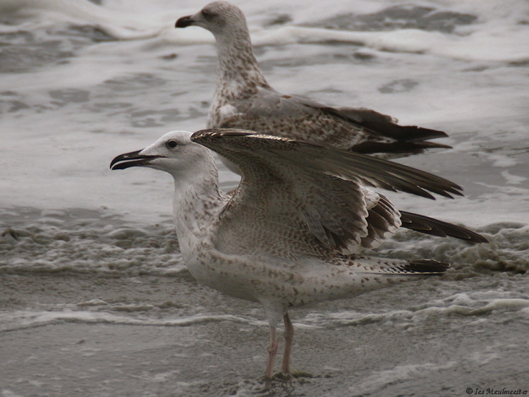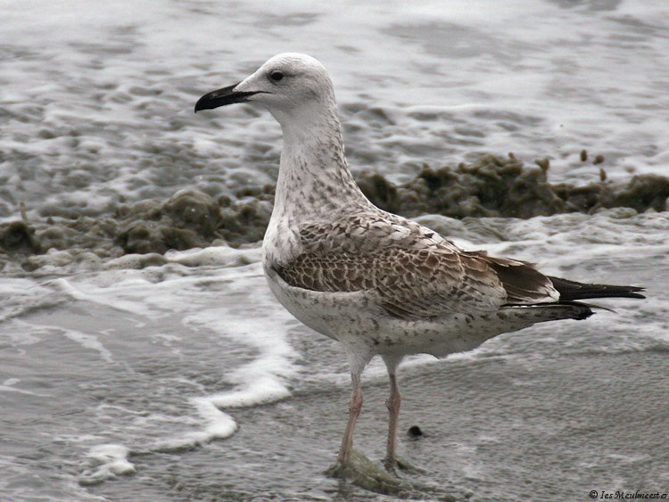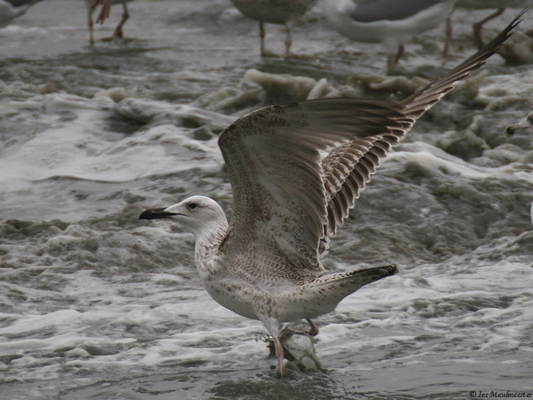 Larus cachinnans 1cy, October 25 2009, Westkapelle, the Netherlands. Picture: Ies Meulmeester. In every respect a very typical and beautiful 1cy Caspian Gull. This bird has replaced nearly all scapulars to second generation feathers, all other coverts are still juvenile. The coverts are white-edged and show hardly any barring. The median and especially the greater coverts have white tips. The under-wing coverts become very white coloured. The inner five primaries of the long wing have a pale inner and a dark outer web, in a spread wing creating a "Venetian blind", Also note the pale "apical spots" on the outer webs of P2-3. |