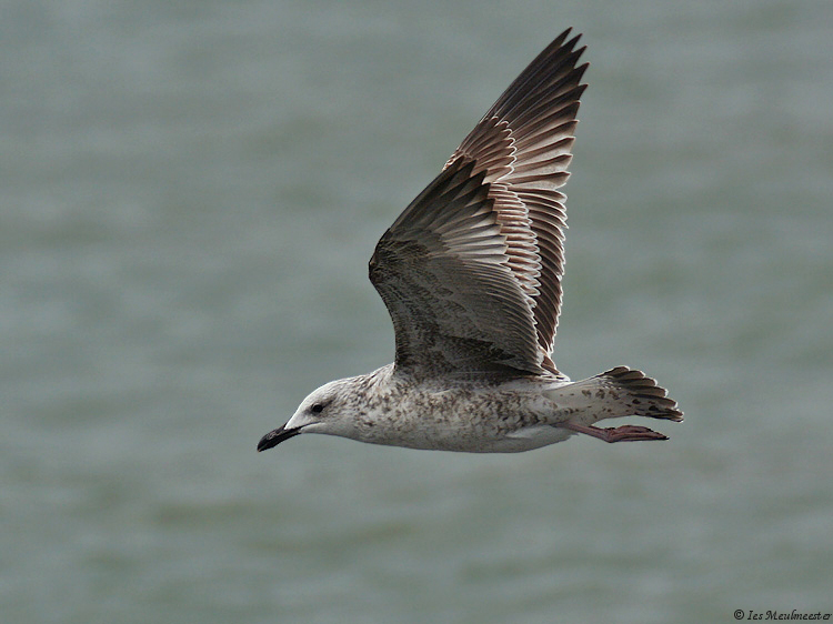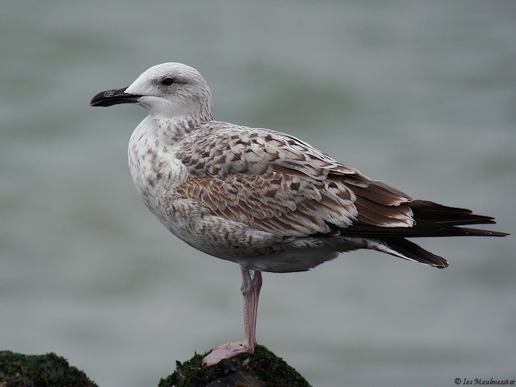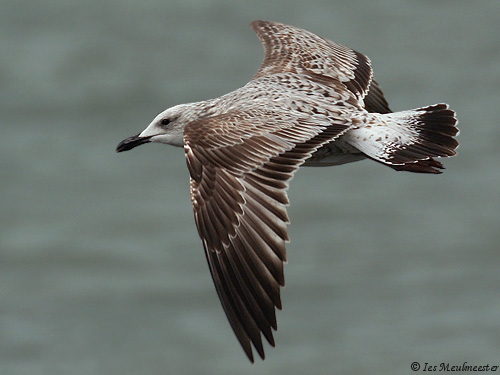 Larus cachinnans 1cy, October 22 2009, Westkapelle, the Netherlands. Picture: Ies Meulmeester. A nice male Caspian Gull, note the very broad white tips on the greater coverts. Nearly all scapulars are replaced by second generation feathers and also the inner-most greater coverts and a few median & lesser coverts. The underwing-coverts are dark patterned, some coverts are dropped but most are still old and not replaced by new generation whitish feathers. |