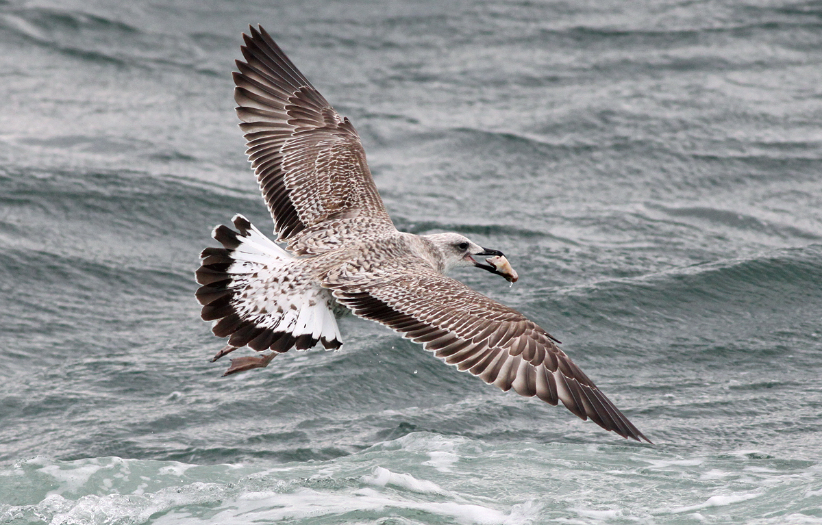 Larus cachinnans 1CY, October 19 2013, North Sea off Texel, The Netherlands. Picture: Albert de Jong. Bold pattern on 2nd gen scaps, tappering tail pattern and lack of apical spots like in michahellis (which it may be). |
