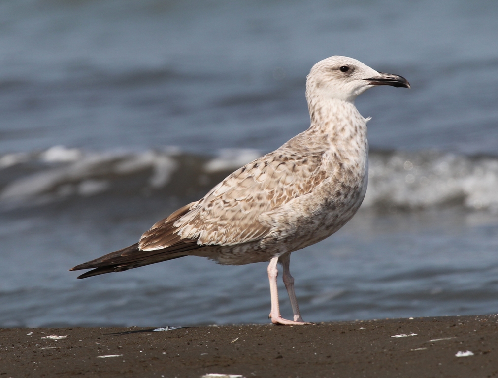 Larus cachinnans 1cy, September 12-24 2011, Sijazan, Azerbaijan. Picture: Chris Gibbins. Post-juvenile moult in scapulars almost completed. Most MC, most LLC, several LC and inner GC replaced as well. Tertials still juvenile. Note flecking on head and short legs. |