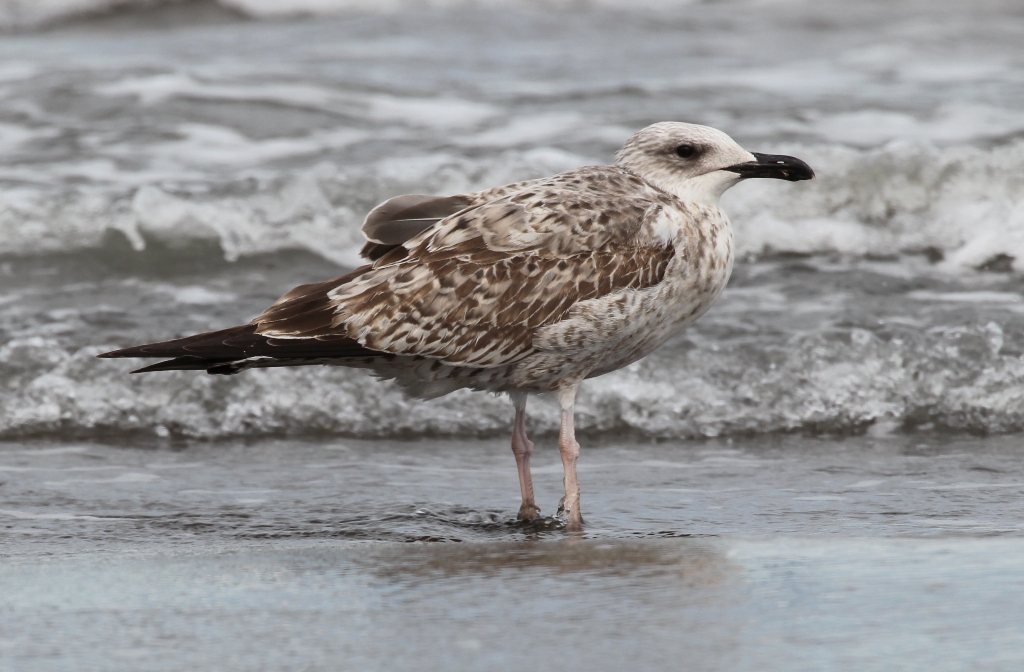 Larus cachinnans 1cy, September 12-24 2011, Sijazan, Azerbaijan. Picture: Chris Gibbins. Streaking on head and masked appearance. 2nd gen inner GC, single MC and single LLC and LC. Fresh feathers with single shaft streak and thin bar. |