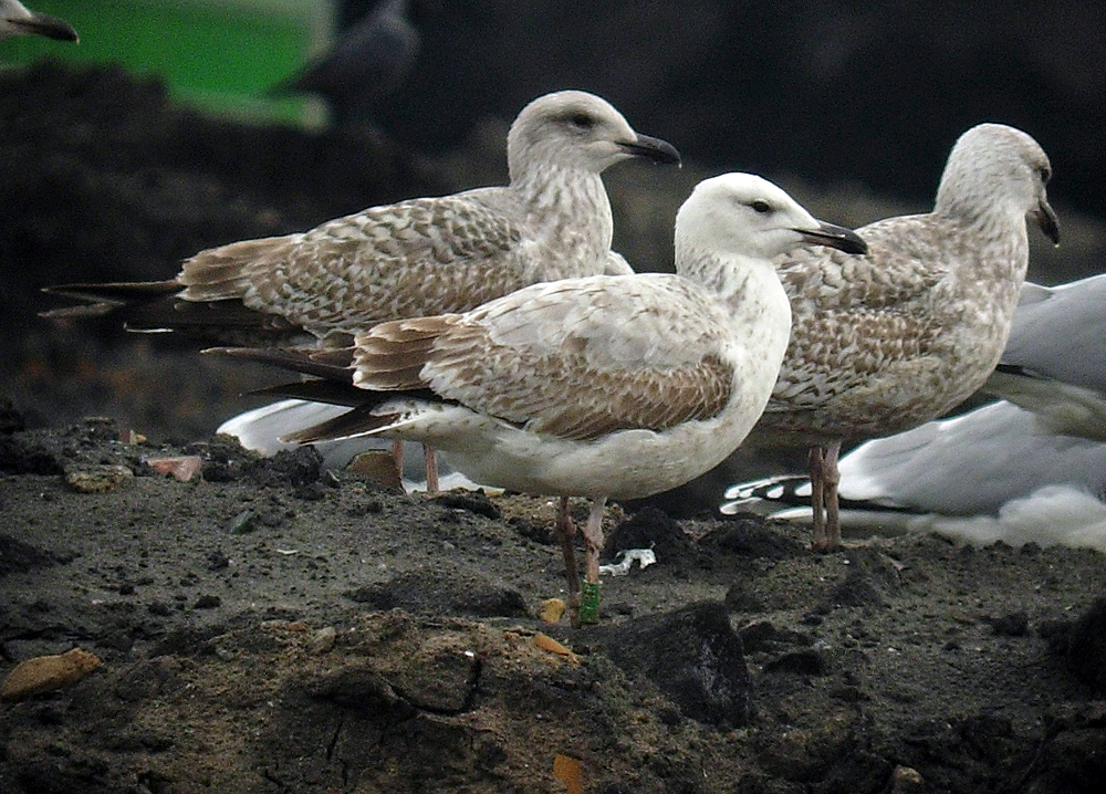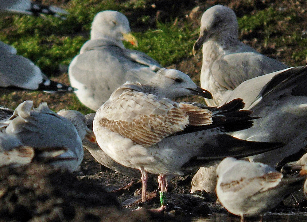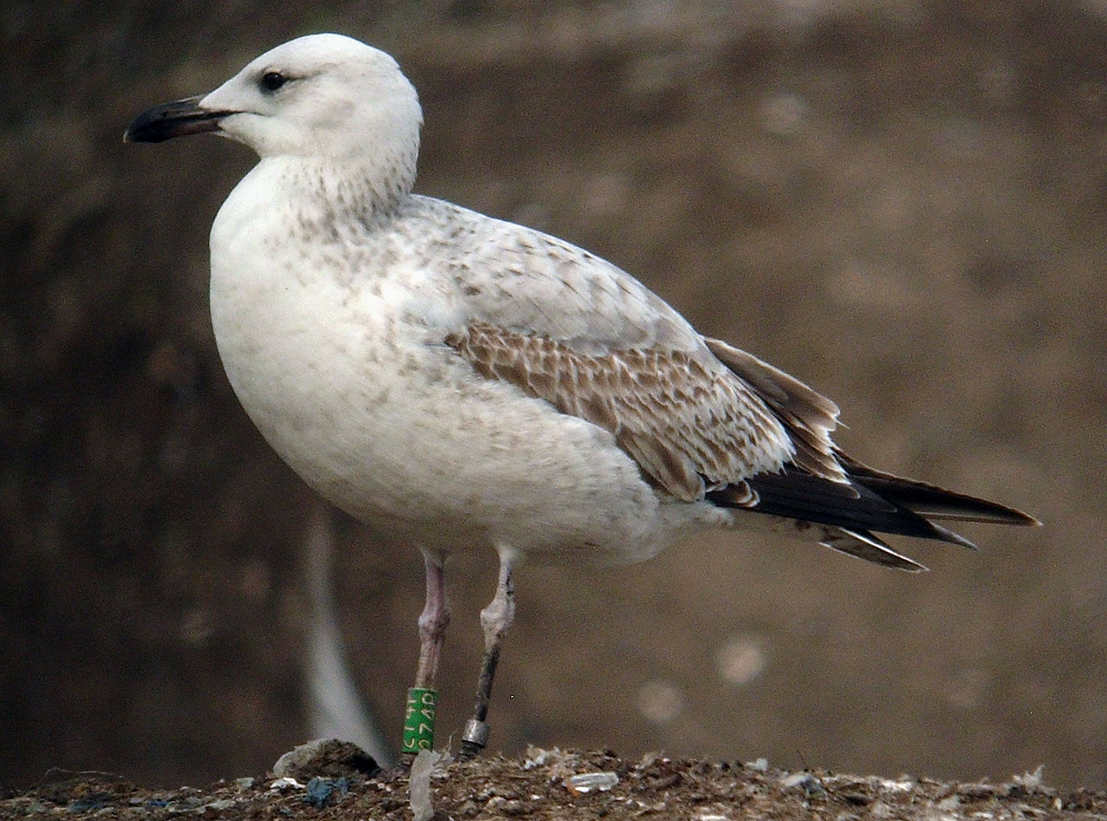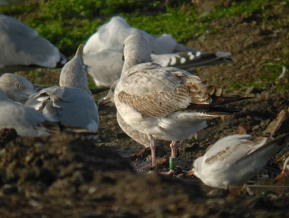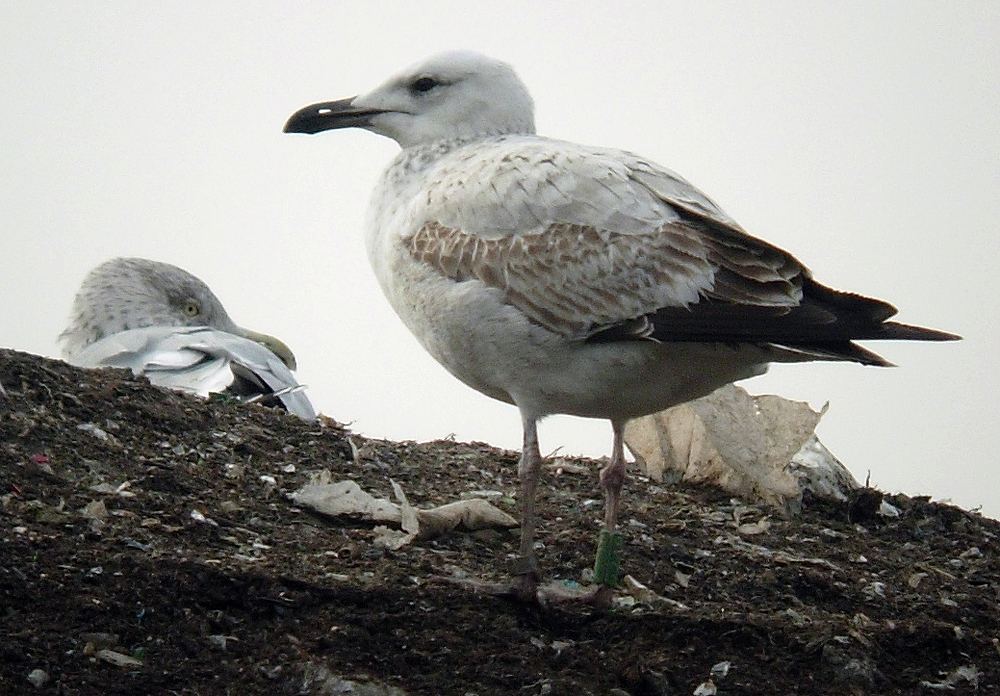 Larus cachinnans 1CY - 2CY 274P December 2007 - February 2008, Deponie Pohlsche Heide - Minden, Germany (52°23'05N, 08°46'45E). Picture: Armin Deutsch. Green ring from Poland. Ringed as pullus green 274P & metal PLG DN-21558 on May 18 2007 in Zwirownia Zakole, Poland (50°02'N, 19°28'E). Zakole = gravel pit, Zwirownia is along the river Oder. below: cachinnans 2CY 274P February 28 2008, Deponie Pohlsche Heide - Minden, Germany (52°23'05N, 08°46'45E). Picture: Armin Deutsch. 1W cachinnans, showing silvery grey scapular region. Note very broad tail-band.