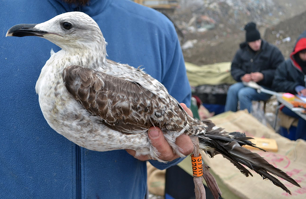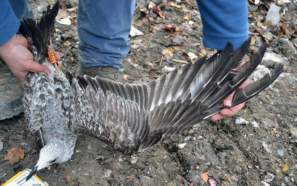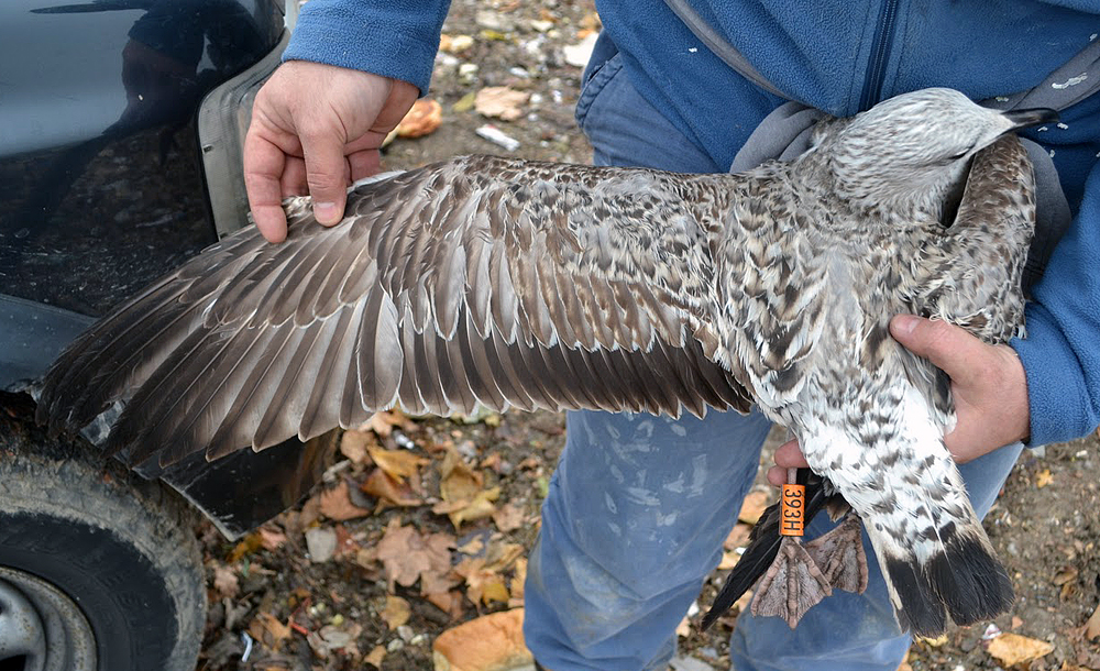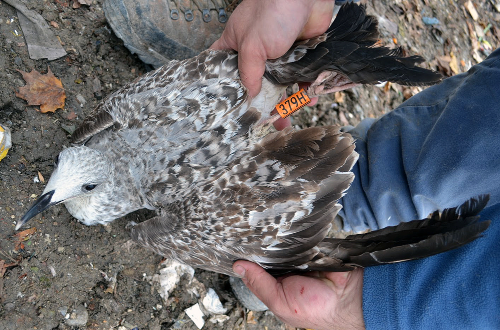 Larus cachinnans? 1CY 379H November 20 2011, Jakuševec-Zagreb, Croatia. Picture: ringing team Luka Jurinovic. Orange 379H, ringed at Zagreb landfill. Difficult bird. Note strong resemblance to michahellis: relatively extensive streaking on head for cachinnans, but also note new grey scapulars showing just a dark shaft streak, Venetian blind effect on inner primaries, and simple pattern on (inner) greater coverts. White tipped bill commonly seen in michahellis and lack of apical spots on outerwebs of inner primaries also more typical for michahellis.