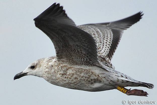 Larus cachinnans 1CY 3L1H September 16 2010, Mangalsala, Riga, Latvia. Picture: Igor Denisov. Yellow 3L1H, probably ringed as pullus in 2010 in a mixed colony of Herring and Caspian Gulls in Kretuonas lake, Lithuania. Note piano-key pattern on inner GC and strong barring on underwing. |