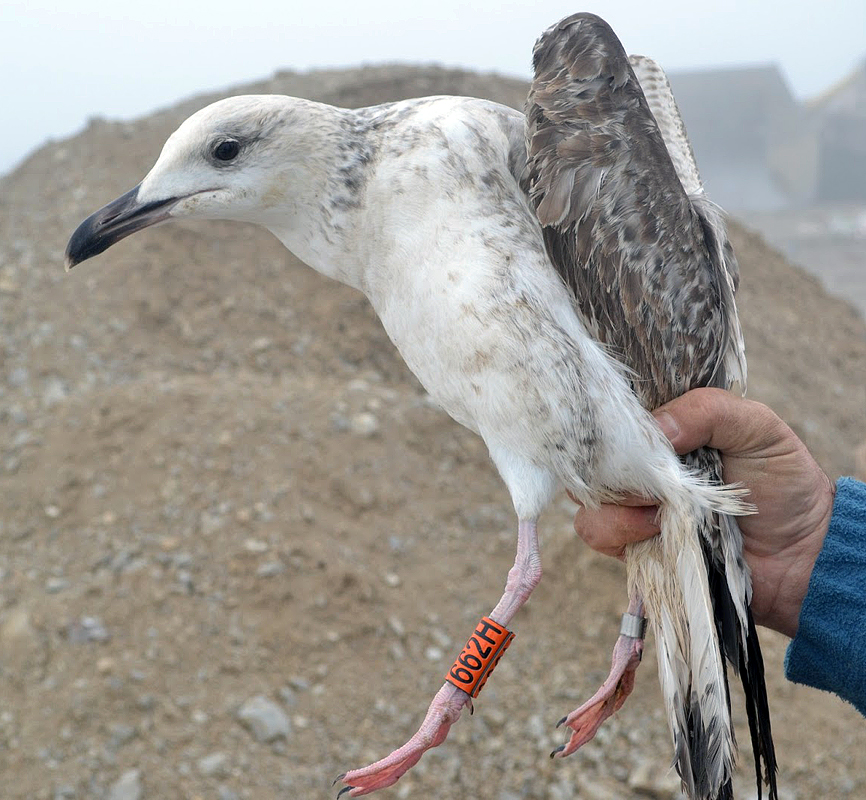 Larus cachinnans 1CY 662H December 17 2012, Jakuševec-Zagreb, Croatia. Picture: ringing team Luka Jurinovic. Orange 662H, ringed at Zagreb landfill. Classic cachinnans. Note pale head, Venetian blind effect on inner primaries, apical spots on outerwebs of inner primaries, and simple pattern on (inner) greater coverts. Overall brown-greyish wash over plumage and broad tail-band of evenly width towards outer rectrices and multiple subterminal bands on outerweb of R6.