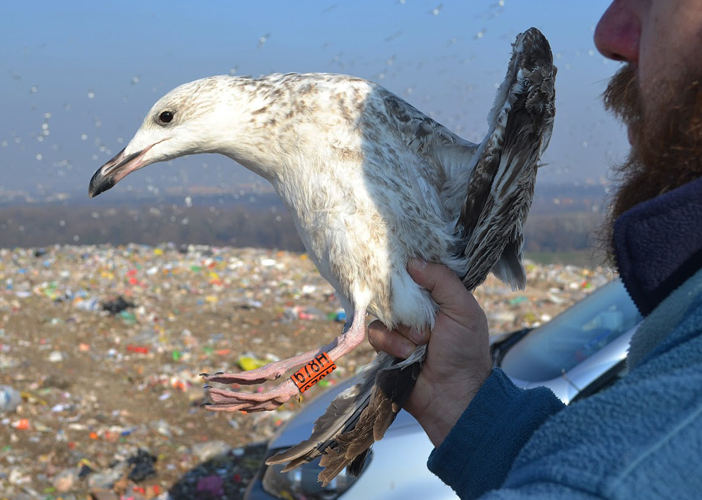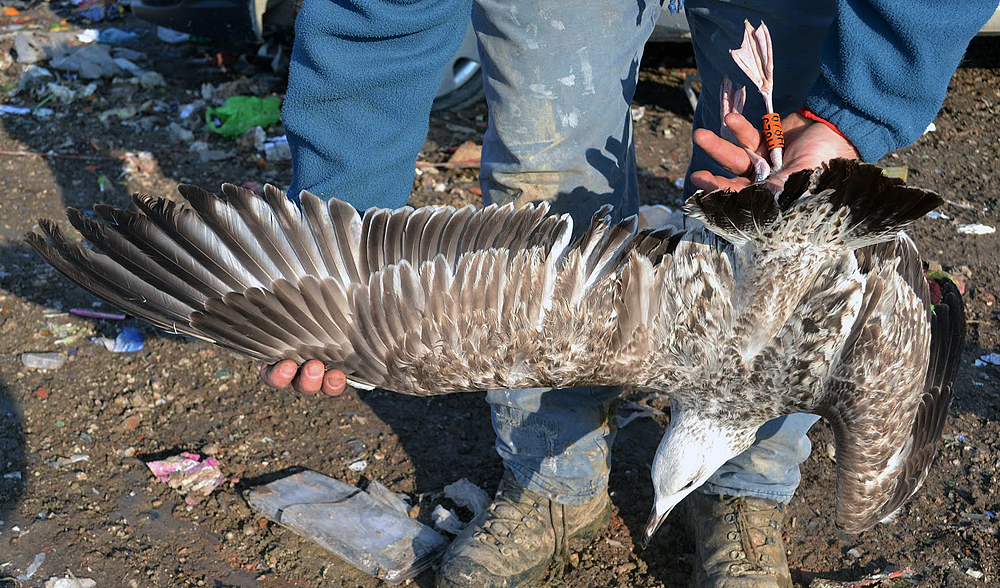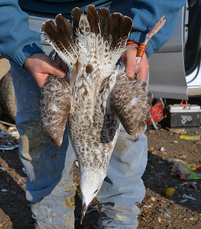 Larus cachinnans 1CY 678H December 31 2012, Jakuševec-Zagreb, Croatia. Picture: ringing team Luka Jurinovic. Orange 678H, ringed at Zagreb landfill. Note pale head, Venetian blind effect on inner primaries, and simple pattern on (inner) greater coverts. Faint apical spots on outerwebs of inner primaries, brown-greyish wash over plumage, and broad tail-band of evenly width towards outer rectrices and multiple subterminal bands on outerweb of R6.