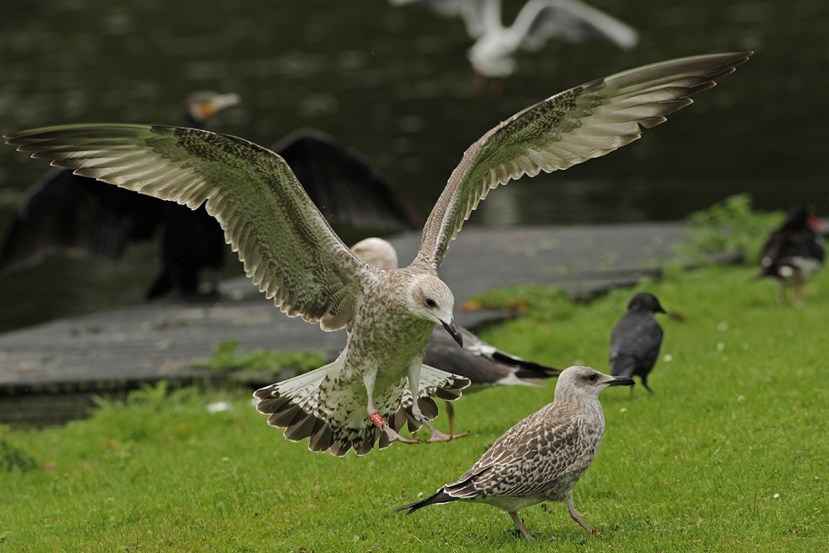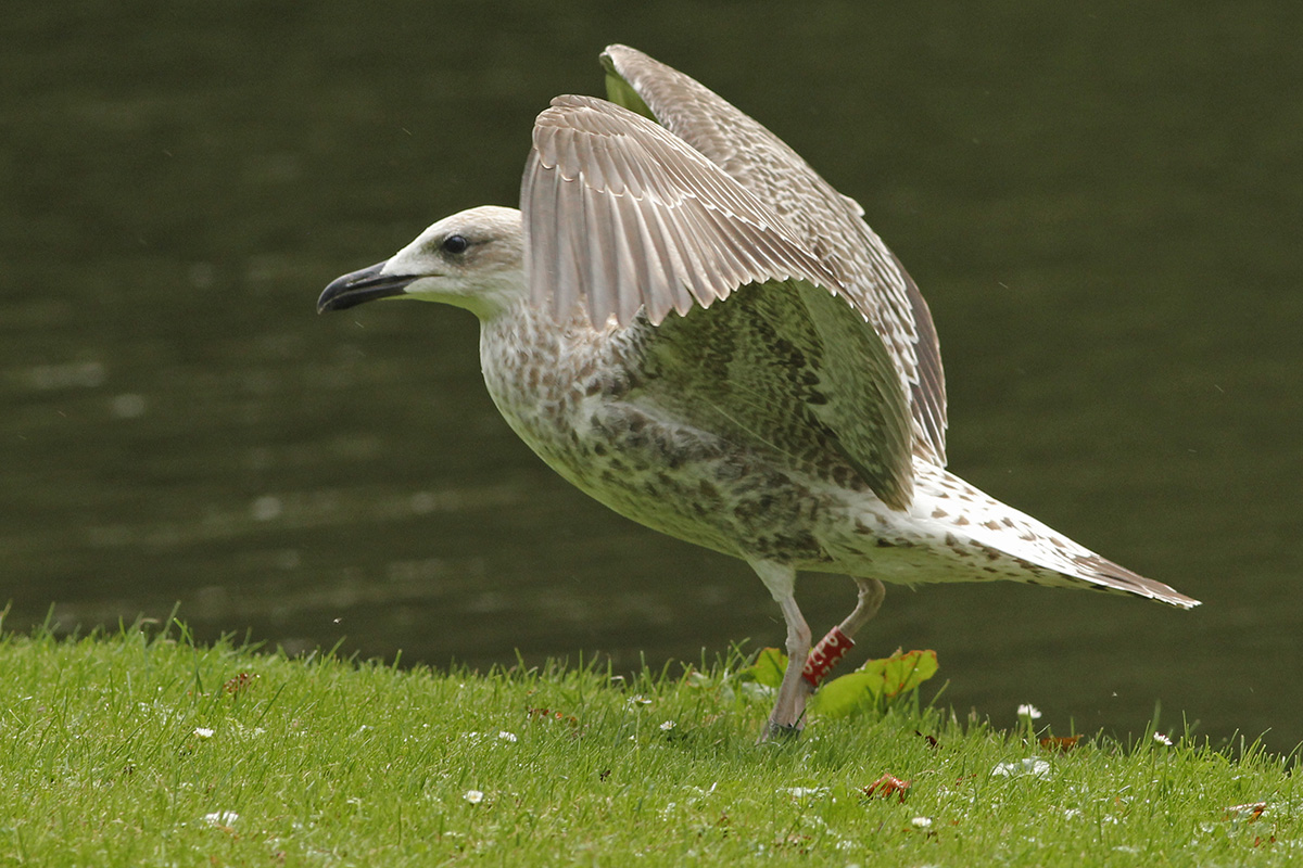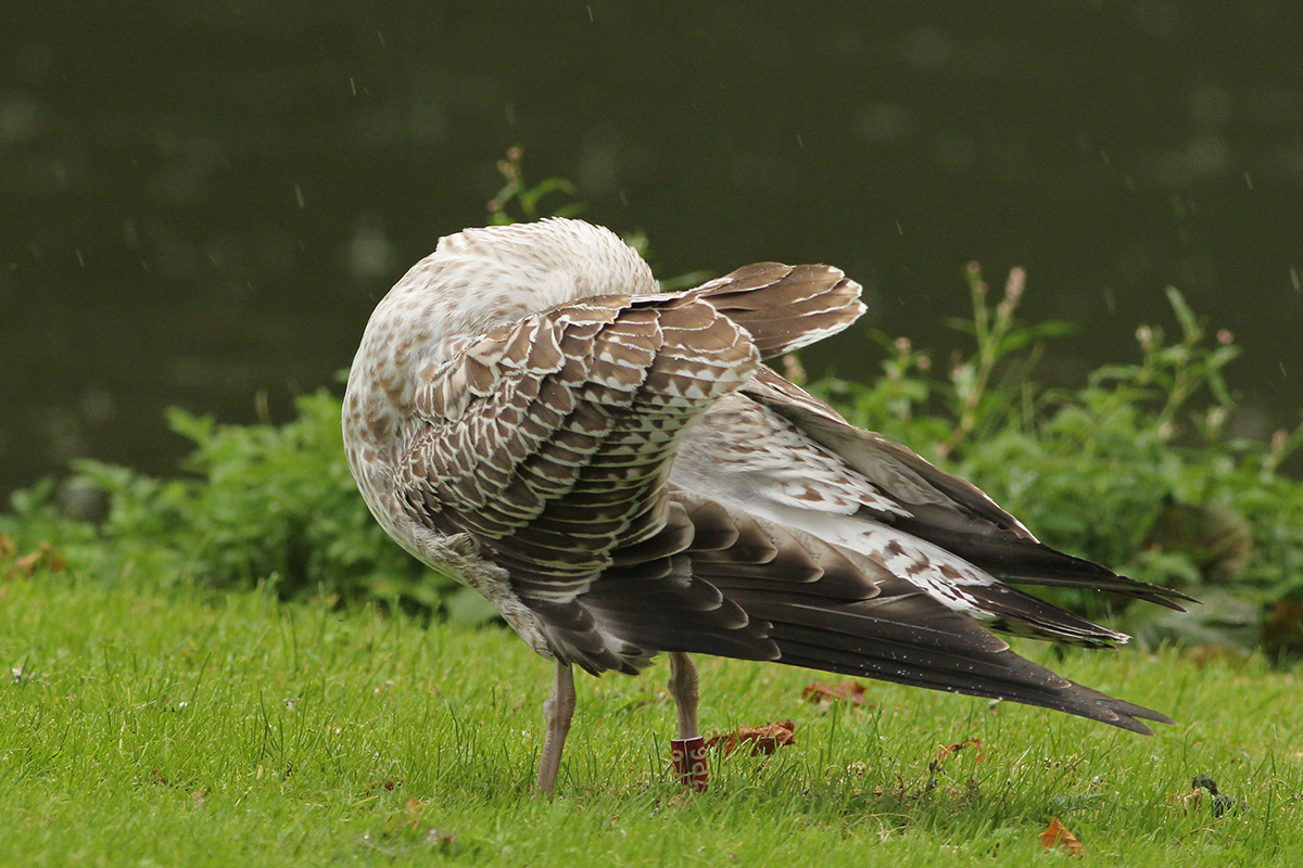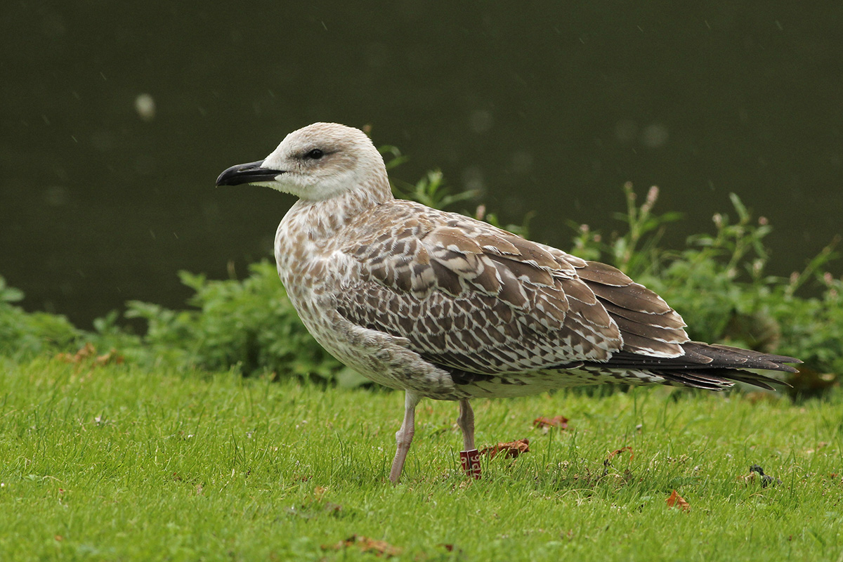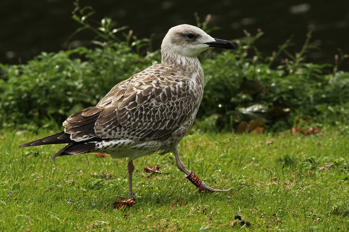 Larus cachinnans 67P6 1CY, August 24 2015, Rotterdam, the Netherlands. Picture: Merijn Loeve. Darvic red 67P6 and metal PLG DN-31567, from Poland: ringed as pullus on May 21 2015 at Kozielno, Paszków, Poland. Moult in scaps has started.