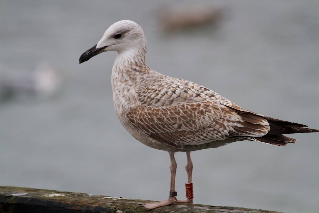Larus cachinnans 68P6 1CY, October 25 2015, Rødvig Harbor, Stevns, Denmark. Picture: Tonny Papillon. Red ring from Poland, ringed as pullus in 2015. By October, all scapulars replaced. Single MC replaced as well. |