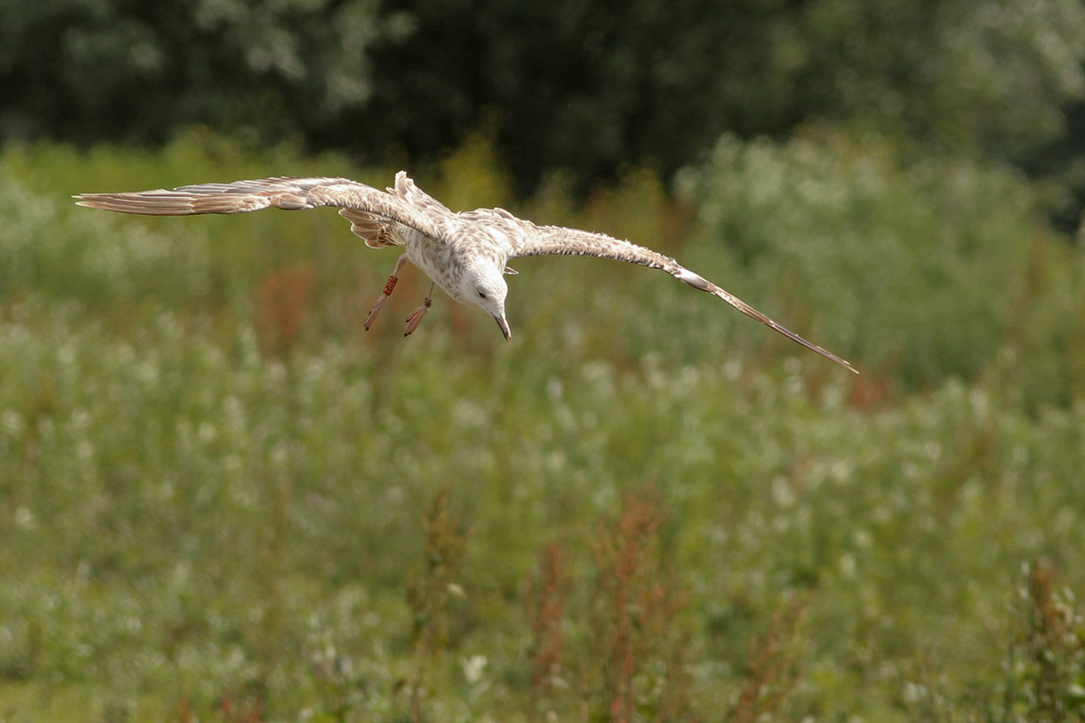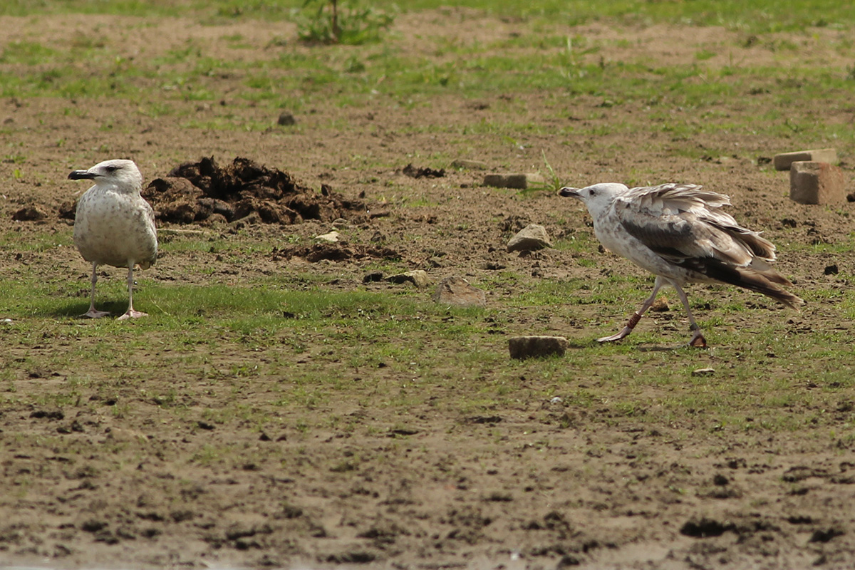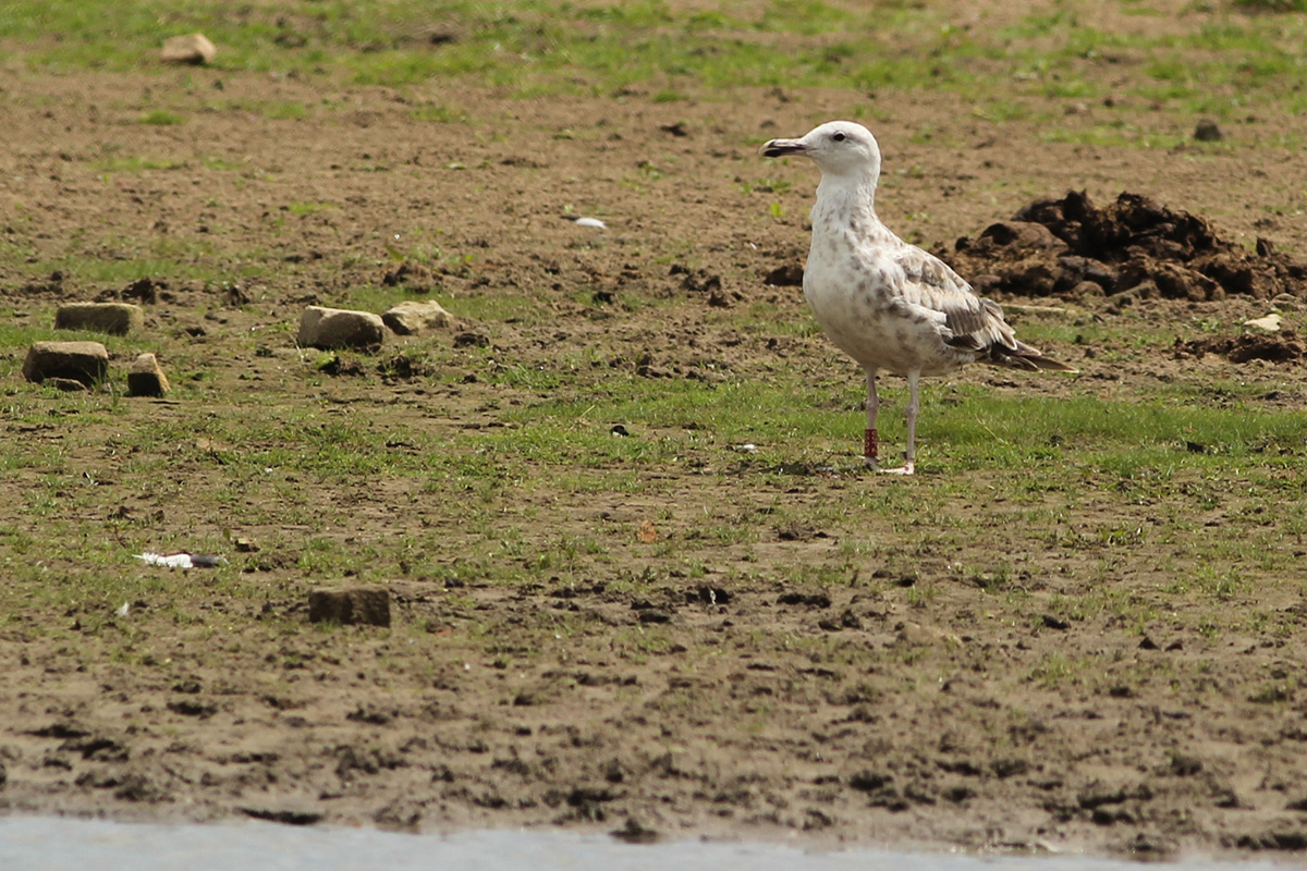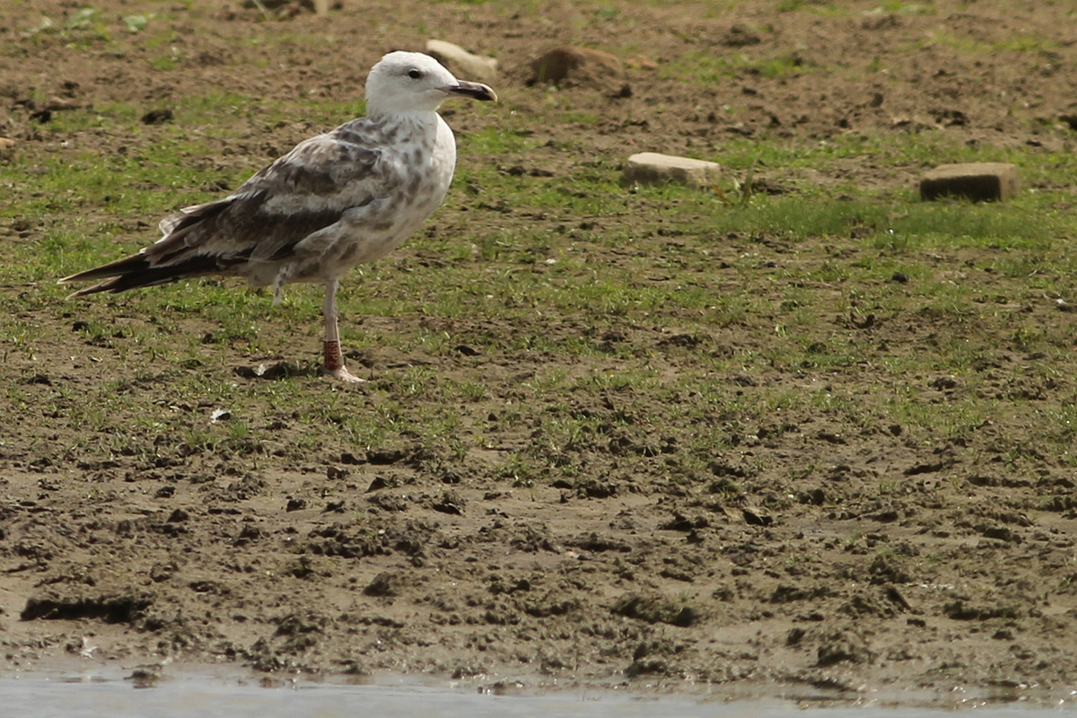 Larus cachinnans 69P2 2CY, June 27 2015, Ooijpolder, the Netherlands. Picture: Merijn Loeve. Darvic red 69P2 from Poland: data pending, probably ringed as pullus on May 21 2015 at Kozielno, Paszków, Poland. P1-P3 f.g., P4-P5 growing, P6 missing, P7-P10 old juvenile. Almost all GC missing. MC new. Row of LLC missing. R and S old juvenile.