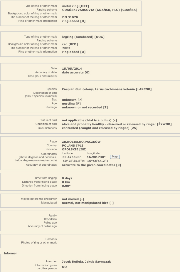 Larus cachinnans 70P2 1CY, December 09 2014, landfill Champteussé-sur-Baconne, Maine-et-Loire, France (47°39N, 0°38W). Picture: Francky Recoquillon. Red 70P2, ringed as pullus on May 15 2014 at Kozielno, Paczkow, S-SW Poland, (50°28' N, 16°58' E). SW Poland, close to the Tsech border. Classic bird. |
