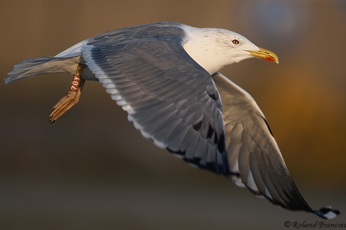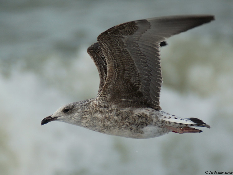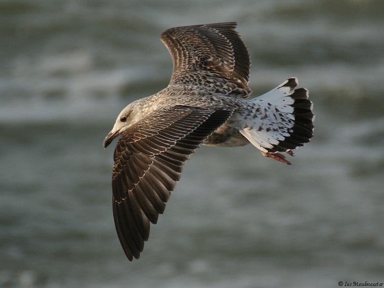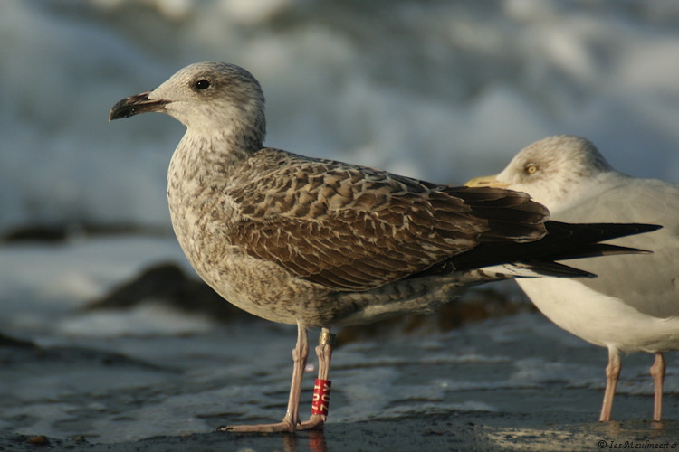 Larus michahellis 1CY & 4CY 70Y October 21 2008, Westkapelle, the Netherlands. Picture: Ies Meulmeester. Ringcode: red 70Y, ringed as pullus on May 31 2008 at Rheinau Freistett, Germany. below: michahellis 1CY 70Y October 21 2008, Westkapelle, the Netherlands. Picture: Ies Meulmeester. This color-ringed 1cy Yellow-legged Gull has moulted most of the scapulars to second generation feathers, but a few (lower) scapulars and all coverts & tertials are still juvenile. The whitish patterns and markings on nearly all greater and median coverts is worn and the feathers are rather brown bleached, so most of the coverts shows a extensive dark central reaching to the edge of the feather with small white fringes. The under-wings are dark showing a typical fine dark marked pattern. Note the bill which start to get paler at the base and the typical tapering solid black tail-band; the rectrices are clearly white from the top of the tail-band till the base of these feathers with only a few dark spots. So there's many contrast between the rectrices and the upper-tail coverts.