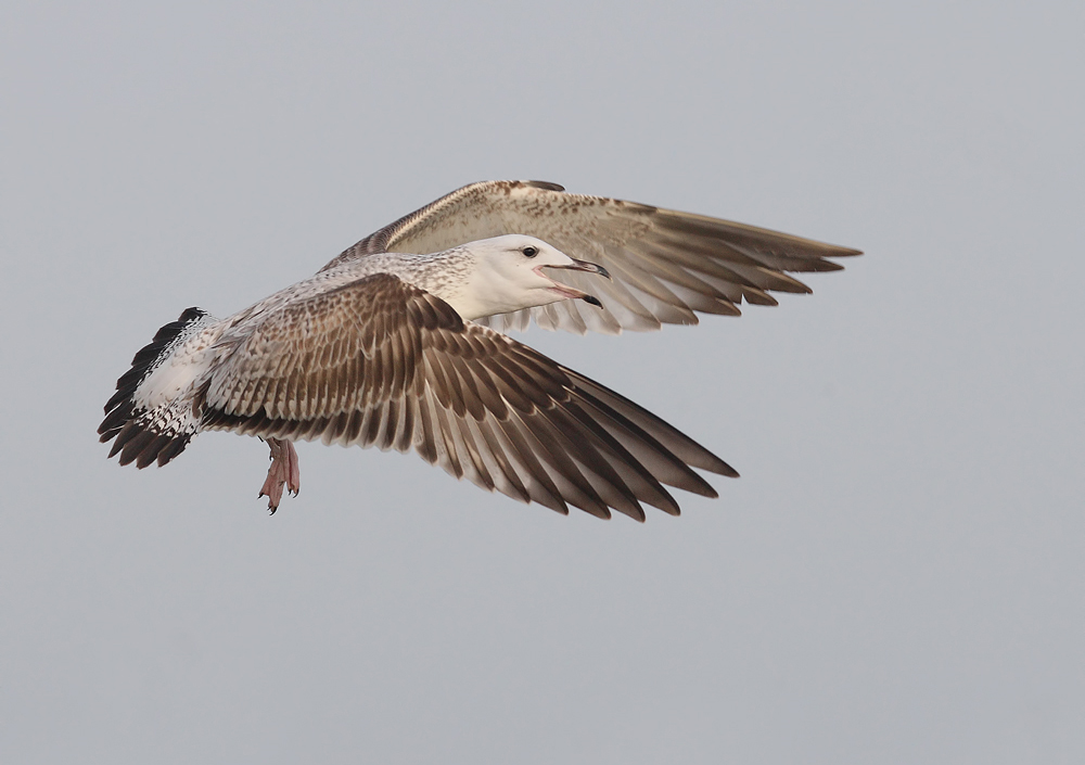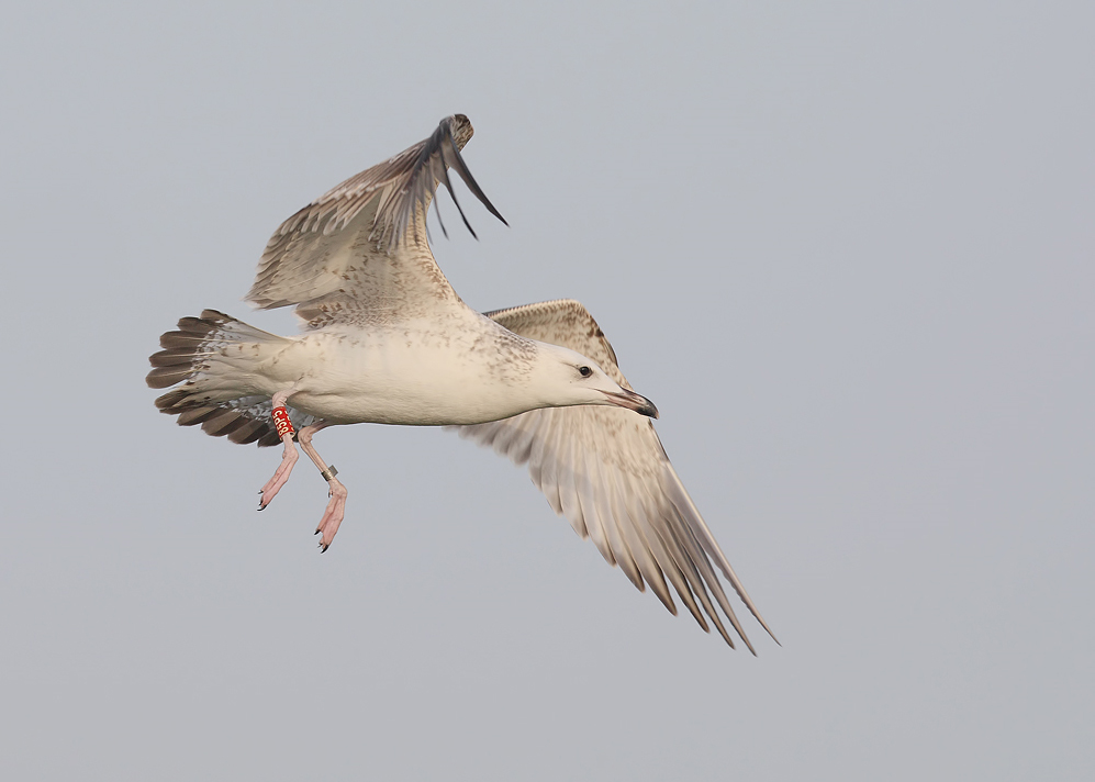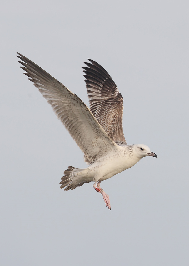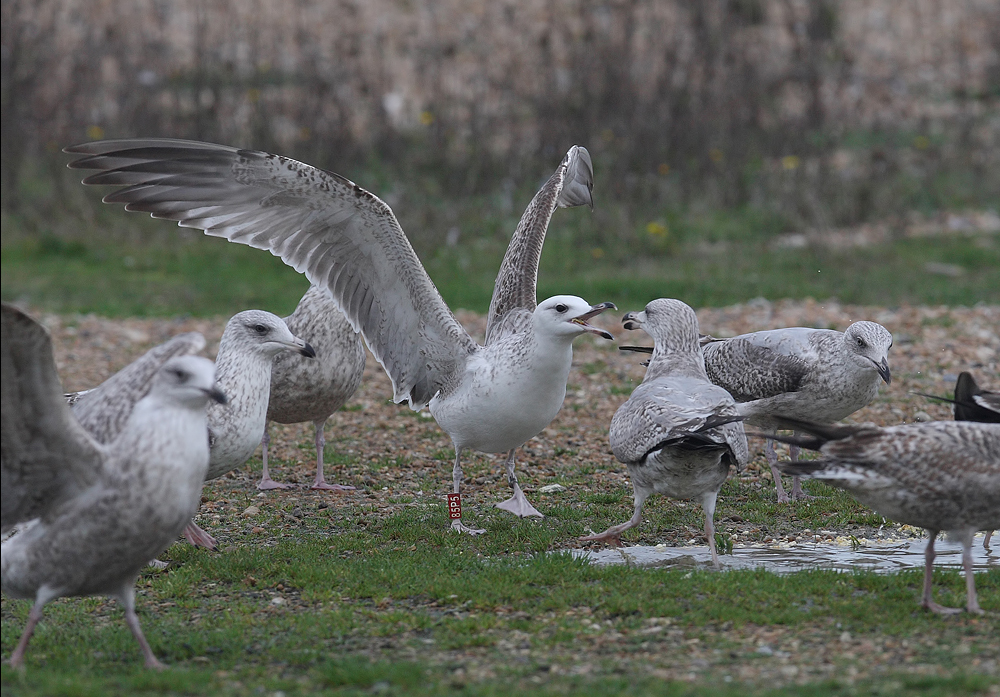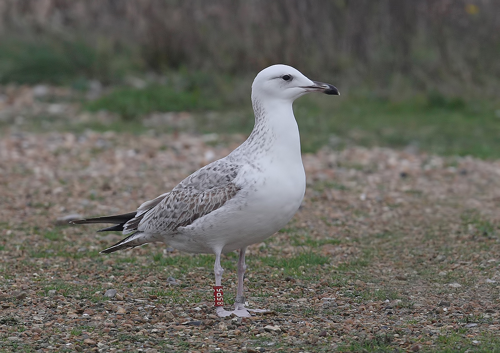 Larus cachinnans 85P5 1CY, November 08 2015, Kent, UK. Picture: Michael Southcott. Visit Michael's Blog: birding the day away! Red 85P5 hatch year 2015. Ringed as pullus on May 21 2015 at Kozielno, Paczkow, S-SW Poland, (50°28' N, 16°58' E) by Jacek Betleja. Was already present on September 10 2015 at Stanwick, UK. and subsequently reported in Kent, UK. Few wing-coverts and upper tertials included in the post-juvenile moult.