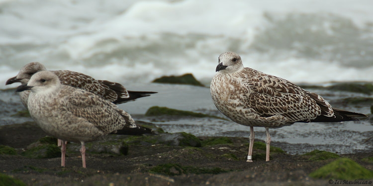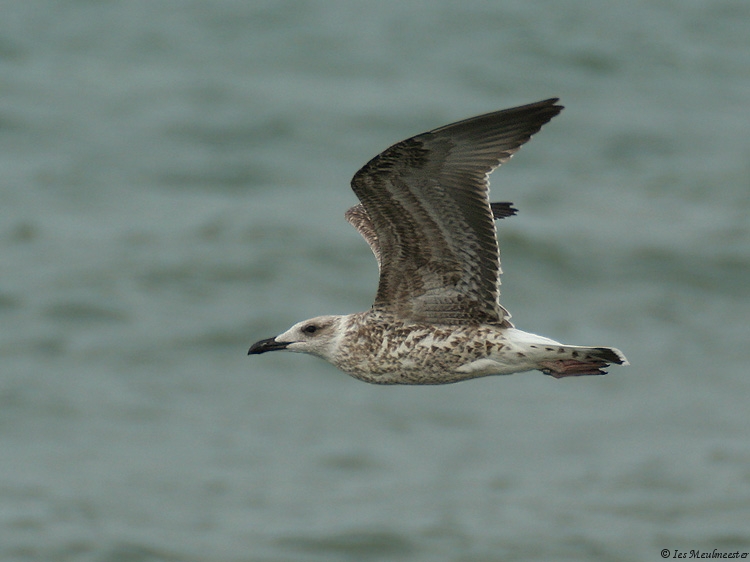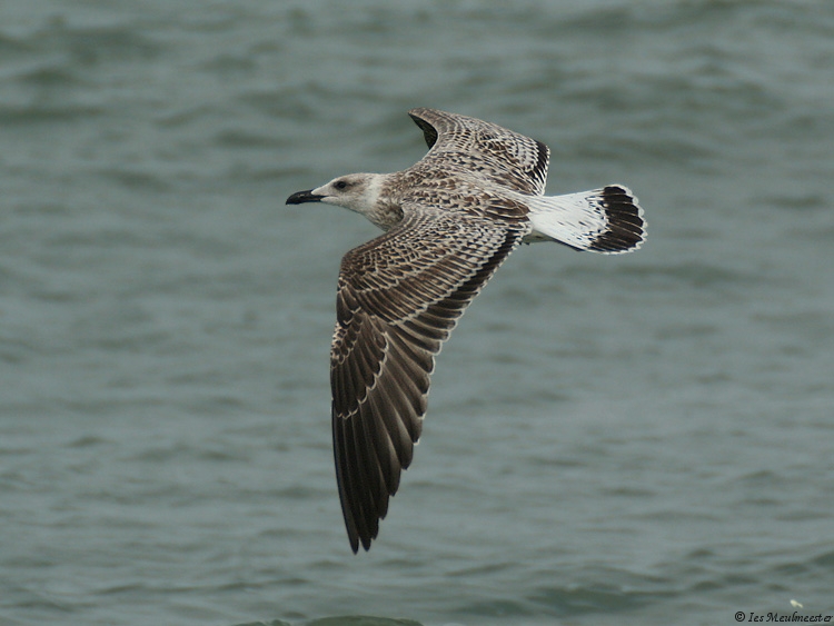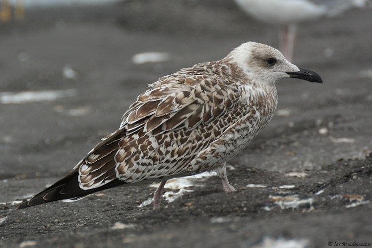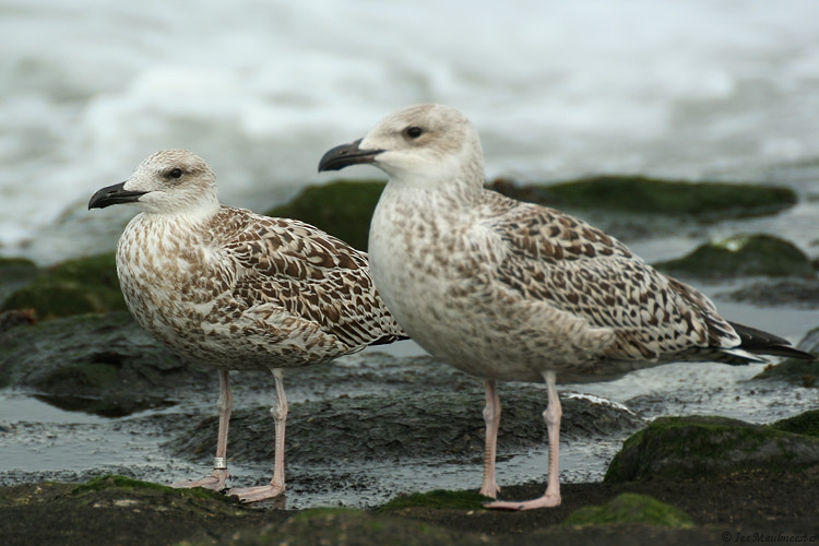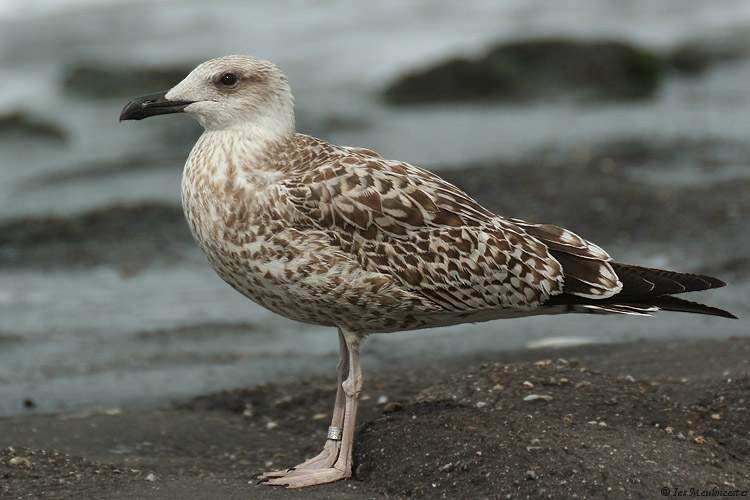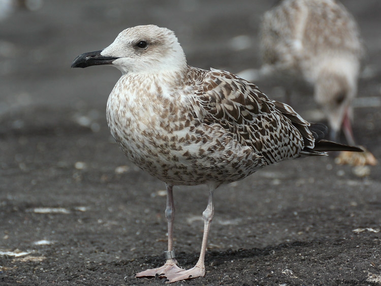 Larus michahellis 1CY CH6258 September 02 2009, Westkapelle, the Netherlands. Picture: Ies Meulmeester. Ringcode: CH6258, ringed as pullus on May 14 2009 at Isola Palmaria Portovenere, Italy. A rather atypical but large and bulky build 1cy Yellow-legged ringed in Italy. In the fifth and sixth pictures you can compare this gull with other large-gull species; in the fifth picture with a small female 1cy Great Black-backed Gull, note the difference in size and build. The tertials and a few juvenile scapulars especially on the left side show a very strange pattern, note the pale cream notched on the inner and outer web, on the tertials it's even creating an anchor pattern. On the tail-bar there's much white on the tips of the rectrices especially on the outers on both sides, so it creates a small white bar below the broad tapering black bar. But otherwise, this individual show nice 1cy michahellis features; typical reddish hue in the brown upper-parts, head and bill shape, very long pointed wings, pale pinkish colored legs and long tibias, whitish head with dark eye mask, pale window pattern on the inner primaries, black tapering tail-bar with contrasting white rump and upper-tail coverts above, dark anchor pattern on the second generation scapulars, fine dark marked pattern on the underwing coverts, etc...