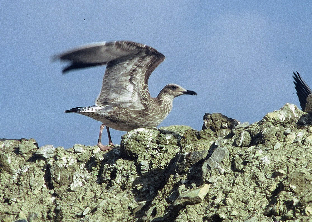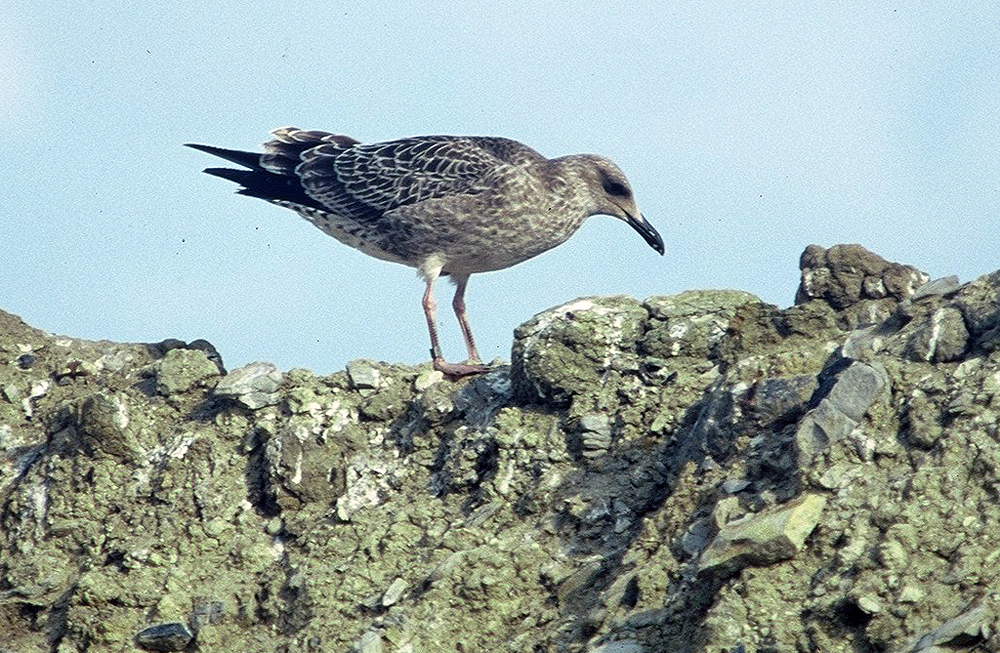 Larus cachinnans 1CY PLG DA-07404 July 14 1999, Deponie Coerde - Münster, Germany (52.00.39N 07.38.48E). Picture: Armin Deutsch. Ringed as pullus on May 08 1999 at Tarnow-Klikowa, Poland (50°02' N, 20°58' E). By that time ringed as pullus Larus argentatus, now of course considered Larus cachinnans. Note bill shape, tertial pattern, GC pattern, simple pattern on scapulars and pale underwing.