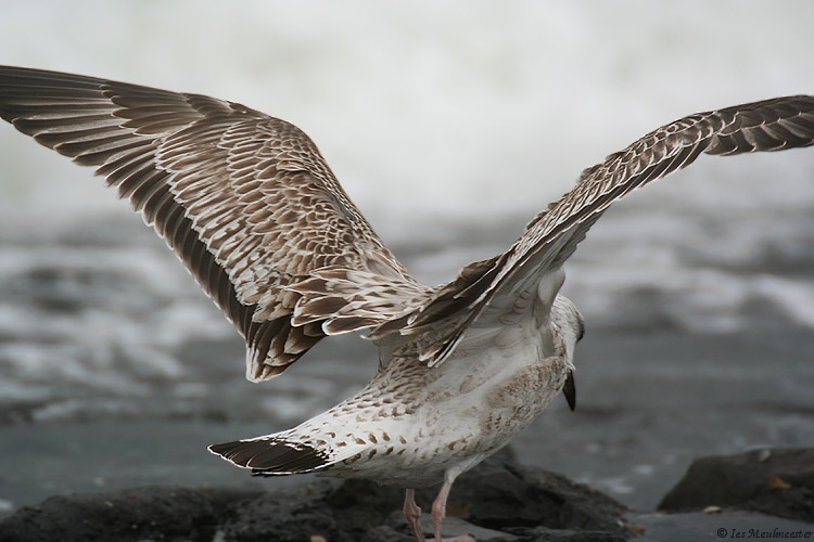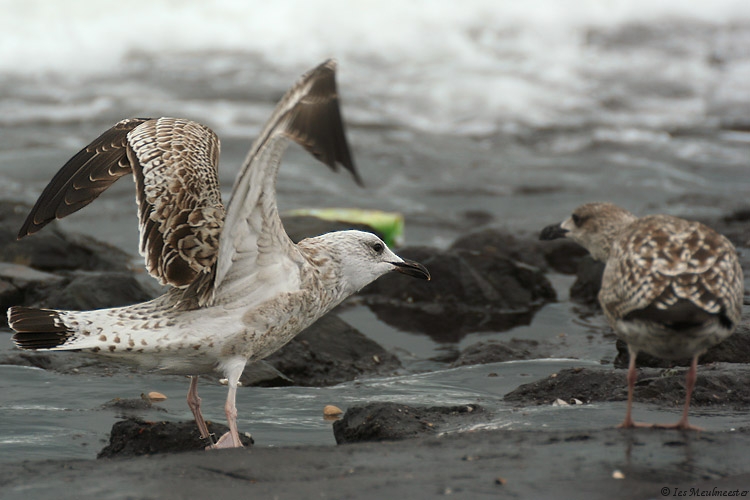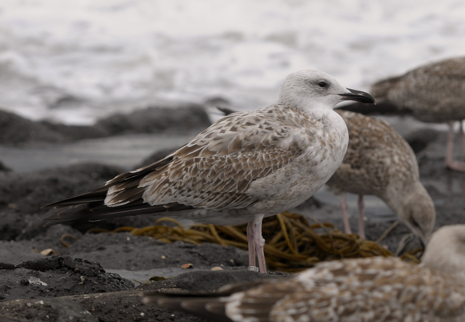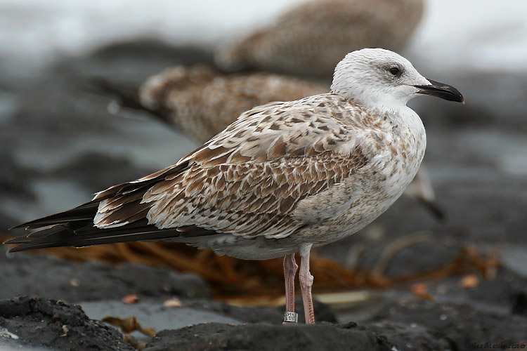 Larus cachinnans hybrid 1cy PLG DN-25914 October 01 2009, Westkapelle, the Netherlands. Picture: Theo Muusse & Ies Meulmeester. Ringed as pullus in Poland. Data pending. Coverts and tertials juvenile. This one is a typical example from a average 1cy cachinnans from Poland. Note the more prominent barring on the greater coverts, the clearer dark anchors and markings on the scapulars, the dark shins and more fine dark streaking on the head and the V-shape markings on the upper-tail coverts. The inner primary pattern is also a bit atypical because the innner webs are not complete pale and the tips of the inner webs are evenly dark as the outer webs.