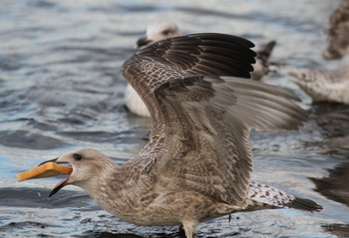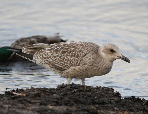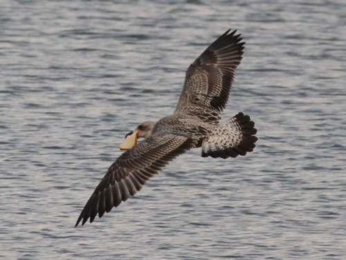 Larus cachinnans 1CY PLG DN-28035 July 21 2012, Simrishamn, Sweden. Picture: Hans Larsson. Metal ring from Poland, PLG DN-28035, cachinnans ringed as pullus on May 10 2012 by Marcin Sidelnik, in Wyspa na Wisle, Kepa Nadbrzeska (= Island in the Vistula River, Kepa Nadbrzeska), near Warschau, Poland (52°01' N, 21°13' E). This colony holds a mixed population, with cachinnans dominating and argentatus, michahellis and even single fuscus breeding as well. Details on the composition of these breeding colonies, see LOCATIONS and RESULTS and ORIGIN & MIGRATION. Classic cachinnans-looking bird. |