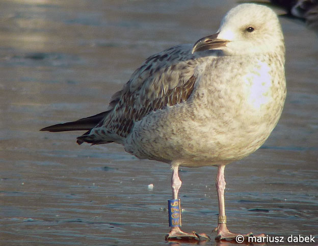 Larus cachinnans 1CY E076 November 22 2011, Swidnica (Witoszowka Reservoir), Dolnoslaskie, Poland. Picture: Mariusz Dabek. Blue E076, probably ringed as pullus on May 13 2011 at Hortobagy Hajdu-Bihar, Hungary. Several coverts replaced. |