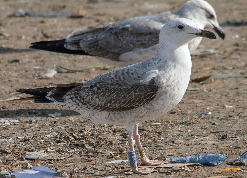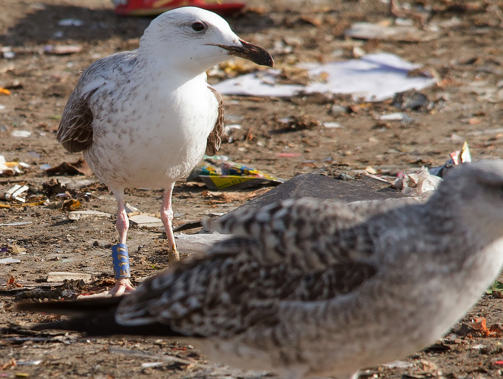 Larus cachinnans 1CY E177 October 27 2013, Zagreb, Croatia (45°45'50"N 16°01'30"E). Picture Luka Jurinović. Blue E177 & metal ring: Budapest VR02389, Caspian Gull (Larus cachinnans) ringed June 05 2013 at Hortobágy Hajdu-Bihar, Hungary (44 47°38'55"N 21°05'30"E), ringed by Szilágyi Attila. Recoveries: No coverts or tertials replaced (except maybe 1x inner LC).