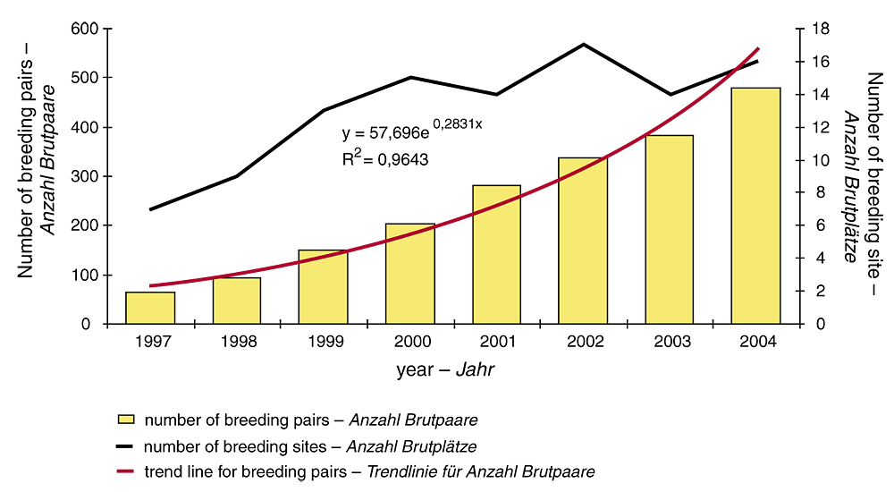 Fig. 2. Caspian Gull increase in Poland, 1997-2004.