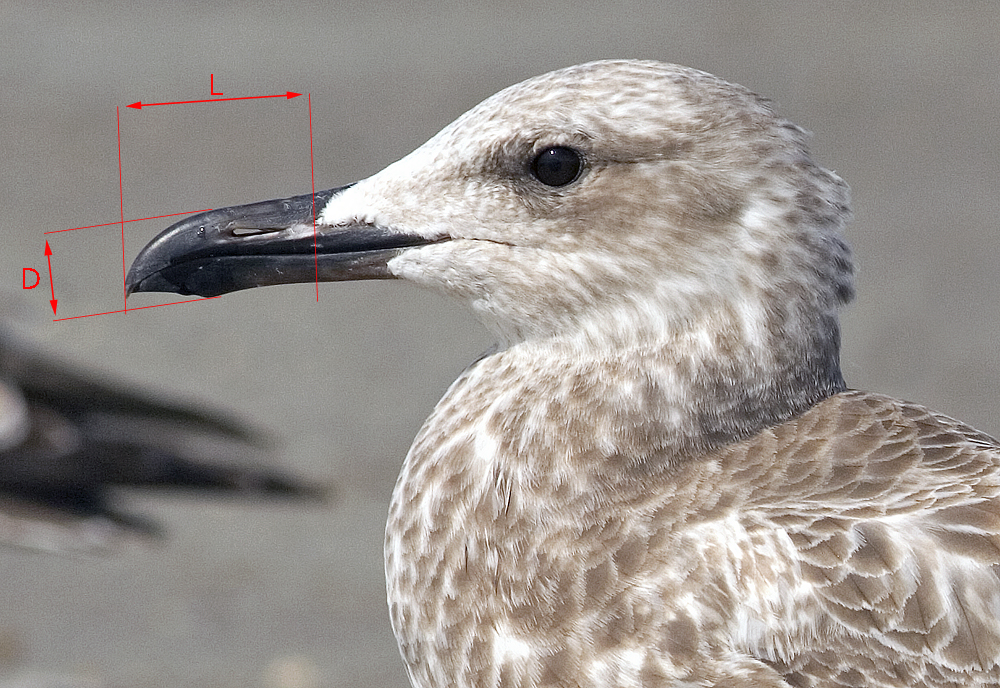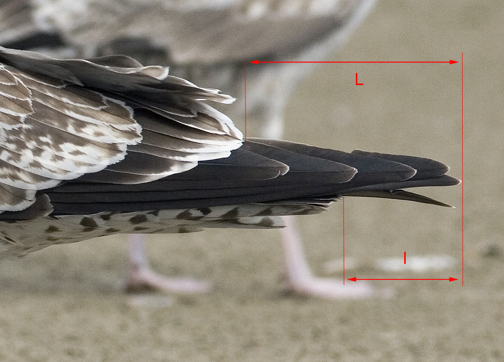 From the Rarities Committee's files - Identification of Caspian Gull. Part 2: phenotypic variability and the field characteristics of hybrids, by Chris Gibbins, Grzegorz Neubauer and Brian Small, IN: BB 104/2011. Fig. 3. Measurements used to derive bill-length to depth and primary-projection ratios for the sample of first-winter birds. Bill ratio is calculated as L/D, primary projection as I/L (projection beyond tail/length beyond tertials). Both images show same juvenile Caspian Gull Larus cachinnans, August 23 2008, IJmuiden, the Netherlands. Picture: Mars Muusse. |