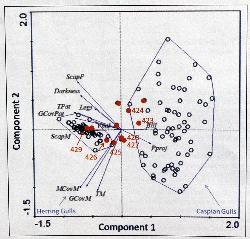 From the Rarities Committee's files - Identification of Caspian Gull. Part 2: phenotypic variability and the field characteristics of hybrids, by Chris Gibbins, Grzegorz Neubauer and Brian Small, IN: BB 104/2011. Fig. 9. PCA biplot showing sample first-winter Herring Larus argentatus and Caspian Gulls L. cachinnans and a number of proven and suspected hybrids. Each circle represents a sample bird. Together, axes l and 2 capture 73.4% of the variance in the sample data. The polygon to the right groups sample Caspian Gulls, while that to the left groups Herring Gulls. Hybrid birds are highlighted in red; numbers relate to plates that show examples of some of these hybrids. Codes for traits are: Bill=bill length:depth ratio, Pproj=length of primary projection, TM=extent of tertial moult, GCovM=extent of greater-covert moult, MCovM=extent of median-covert moult, ScapM=extent of scapular moult, GCovPat=greater-covert pattern, Tpat=tertial pattern, Legs=leg length,Vbul=presence of ventral bulge, Darkness=extent of streaking on head and body, and ScapP is the pattern on second-generation scapulars. |