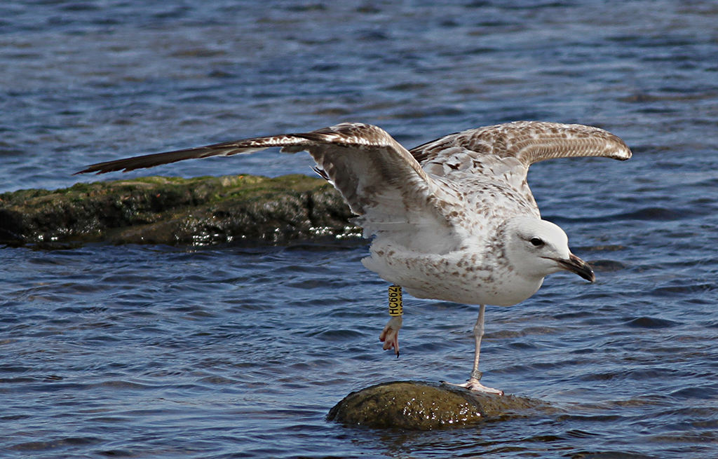 Larus cachinnans 2CY HC662 May 07 2015, Simrishamn, Sweden. Picture: Jörgen Bernsmo. Yellow HC662 and Belarus metal Minsk D00716. Ringed as pullus on July 02 2014 at rooftop breeding colony of Gatovo - Minsk, BELARUS (53o4'N 27o40'E). Recoveries: Complete moult not started yet.