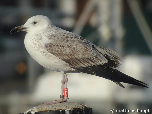 Larus cachinnans 1CY HX89 December 15 2010, Eckernförde Schleswig- Holstein Germany. Picture: Matthias Haupt. Ringing data pending, probably ringed as pullus in 2010 in N Germany. Several inner coverts replaced for 2nd gen feathers in post-juvenile moult. |