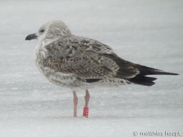 Larus cachinnans 1CY HX90 December 23 2010, Eckernförde Schleswig- Holstein Germany. Picture: Matthias Haupt. Ringing data pending, probably ringed as pullus in 2010 in N Germany. Several inner coverts, and most of LLC replaced for 2nd gen feathers in post-juvenile moult. |
