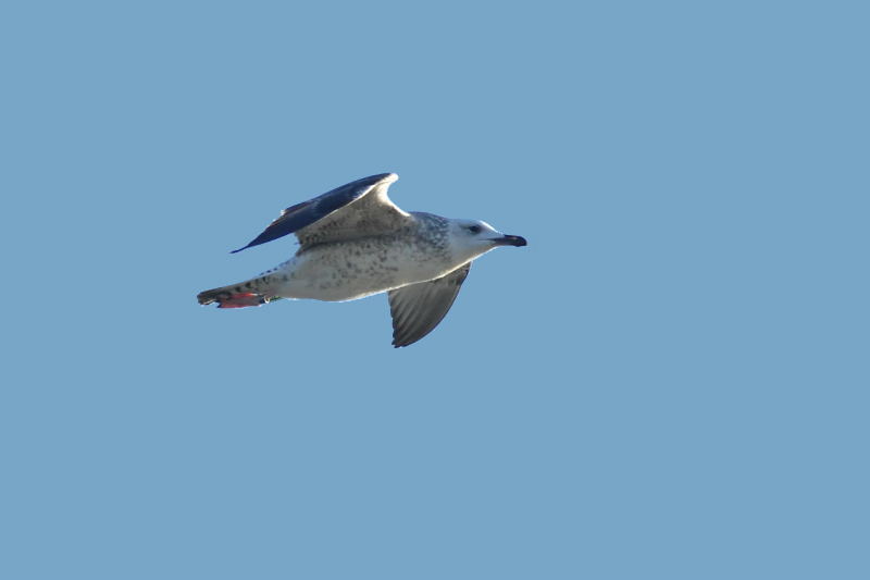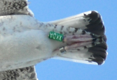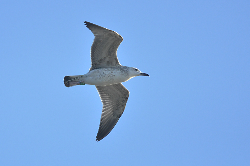 Larus cachinnans 1CY XKDA December 20 2013, Scheveningen, the Netherlands. Picture: Vincent van der Spek. Bird ringed green XKDA, probably ringed as pullus in 2013 in Sachsen, Germany. Note pale underparts and head, but note also rather clean bases of rectrices.