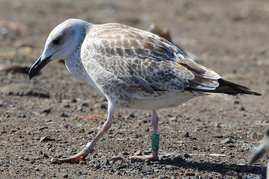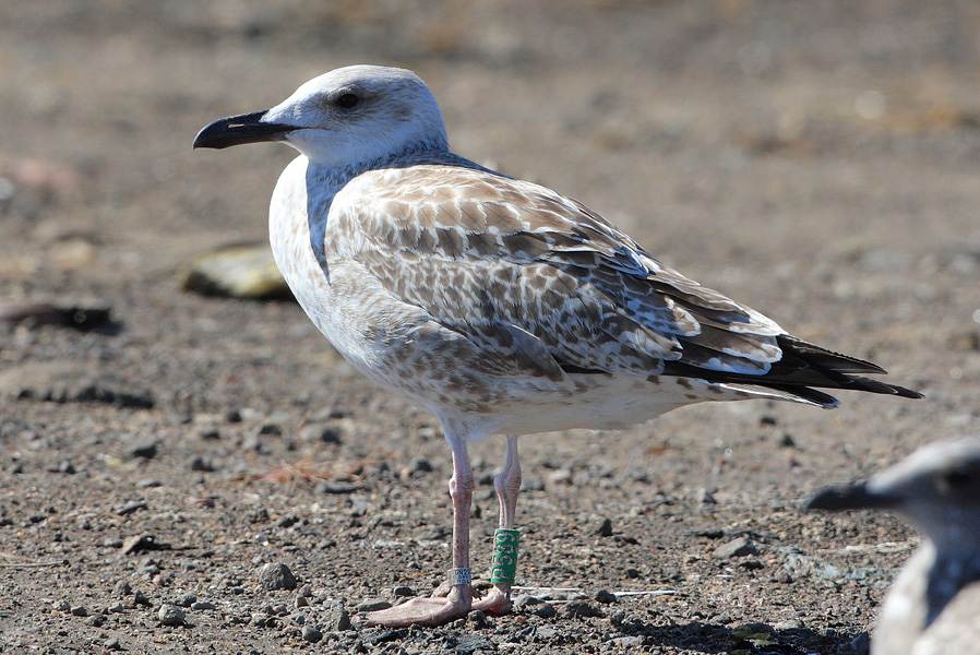 Larus cachinnans 1CY P589 August 04 2012, Kirkkonummi -Ämmässuo, Finland. Picture: Petteri Hytönen. Green P589, ringinmg data pending. Bird probably ringed as pullus on May 30 2012 at Wytyckie Lake Wytyczno Lublin, Poland. Juvenile plumage.