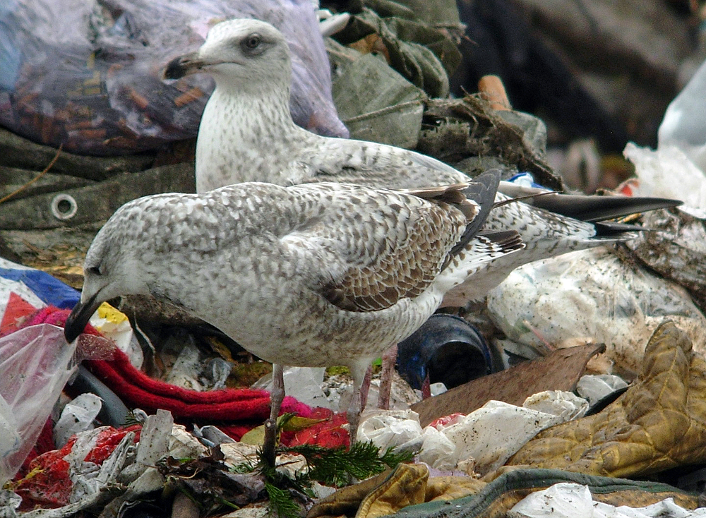 below: cachinnans 1CY PACZ November 05 2009, Deponie Pohlsche Heide - Minden, Germany (52°23'05N, 08°46'45E). Picture: Armin Deutsch. Ill-defined Venetian blind on inner primaries. Pale underwing.