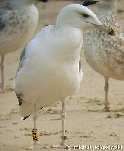 Larus cachinnans 1CY & 3CY PAUS October 12 2009 & December 2011, Sweden & Poland. Picture: Mats Rellmar & Michal Polakowski. Yellow ring from Poland. Ringed as pullus yellow PAUS on May 21 2009 at Palczowice, west of Krakow, S. Poland. below: cachinnans PAUS December 2011, Rybackie, Poland. Picture: Michal Polakowski. Note long legs.