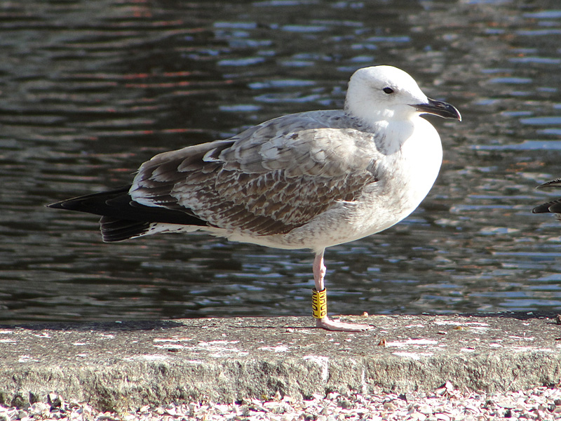 Larus cachinnans 1CY PDHN October 19 2010, Den Haag, the Netherlands. Picture: Frank van der Meer. Yellow PDHN and metal PLG DN-18606; ringed as pullus on May 27 2010, at Kozielno Paczkow Opolskie Poland (50,48333 16,96667). Recorded 4 times in 2010, along the coast in the Netherlands. Scapulars replaced, but all wing-coverts and tertials still juvenile. Note snowy white head. |