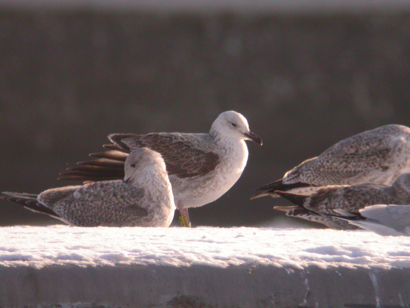 Larus cachinnans 1CY PDNA December 18 2010, Mur de Lixhe - Liege, Belgium. Picture: Pieter Vantieghem. Yellow PDNA, probably ringed as pullus in 2010, in Poland. Recorded again on December 29 2010, at Mur de Lixhe - Liege, Belgium. by Charly Farinelle. Scapulars replaced, but all wing-coverts and tertials still juvenile. |