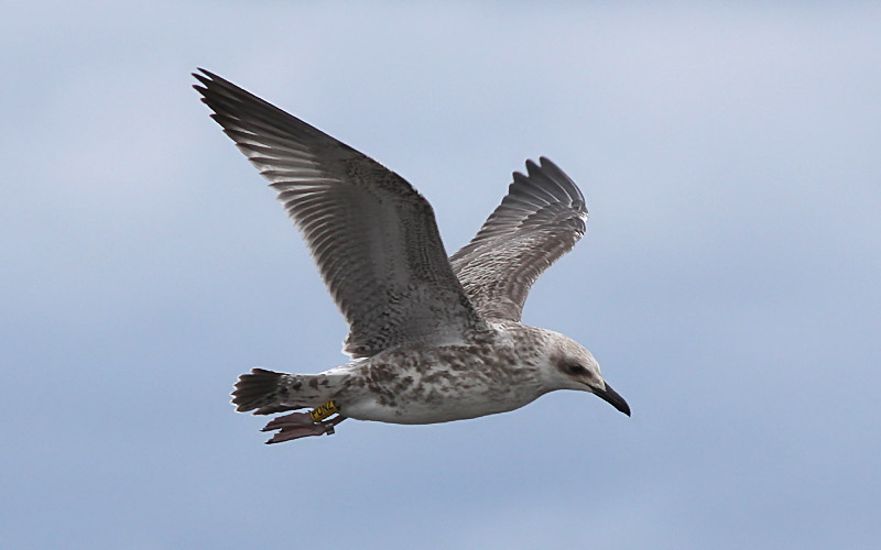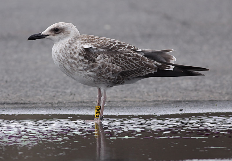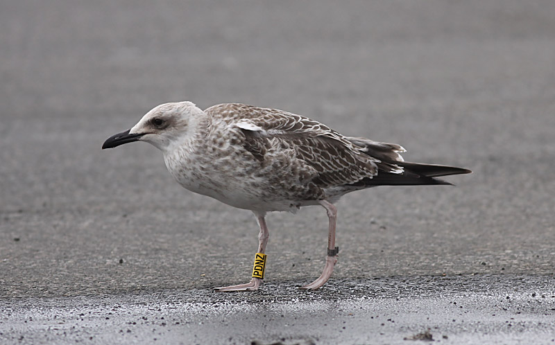 Larus cachinnans 1CY PDNZ July 25 2010, Simrishamn, Sweden. Picture: Jörgen Bernsmo. Yellow PDNZ, ringed as pullus on May 27 2010, at Kozielno Paczkow Opolskie Poland (50,48333 16,96667). Juvenile plumage.