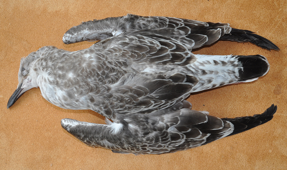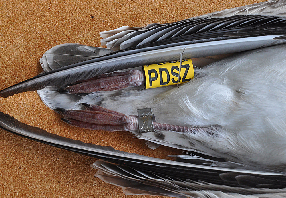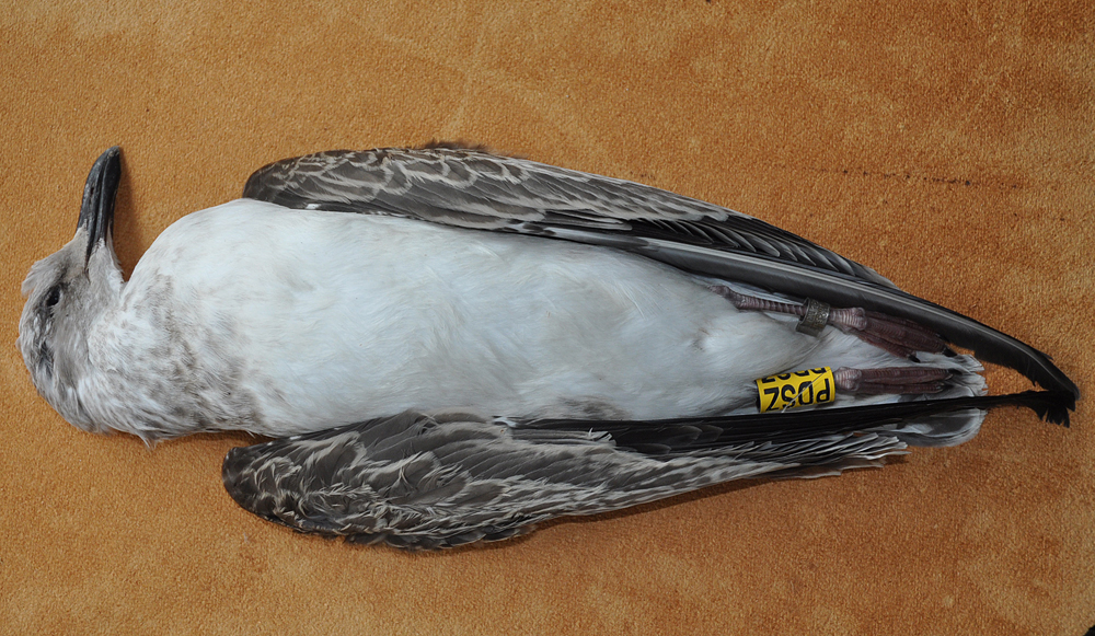Larus cachinnans 1CY PDSZ August 13 2010, Vlieland, the Netherlands. Picture: Kees Camphuysen. Yellow PDSZ and metal PLG DN-18695, ringed as pullus on May 27 2010, at Kozielno Paczkow Opolskie Poland (50,48333 16,96667). Juvenile plumage.
