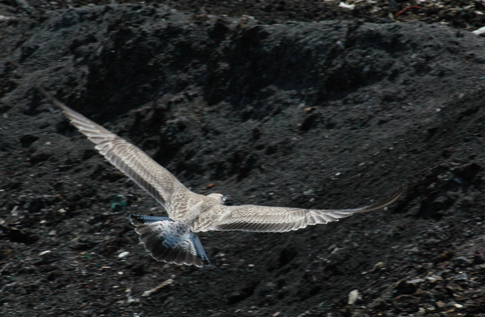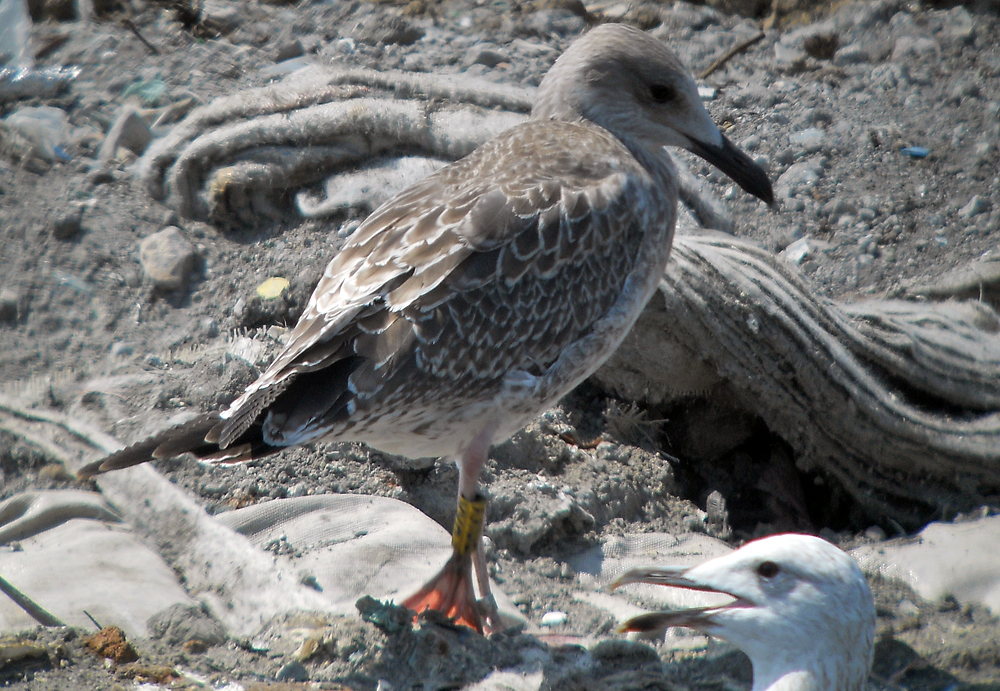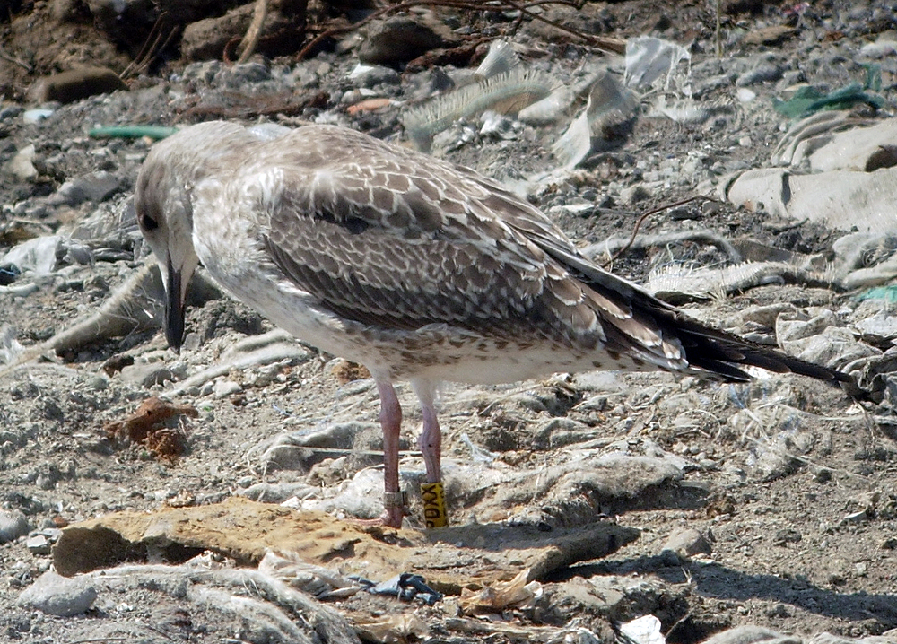 Larus cachinnans 1CY PDXX July 09 2010, Deponie Pohlsche Heide - Minden, Germany (52°23'05N, 08°46'45E). Picture: Armin Deutsch. Yellow PDXX and metal (PLG) DN18760, ringed as pullus on May 27 2010 at Kozielno, Paczkow, S-SW Poland, (50°29' N, 16°58' E). Recoveries: