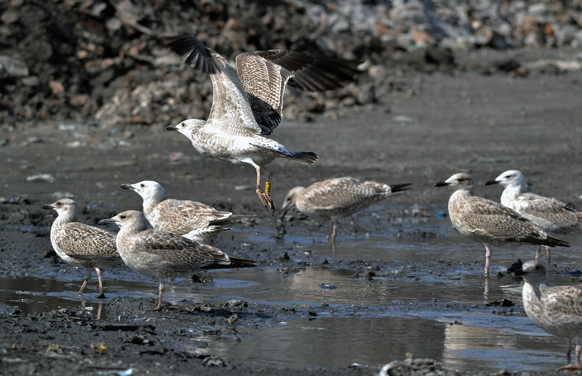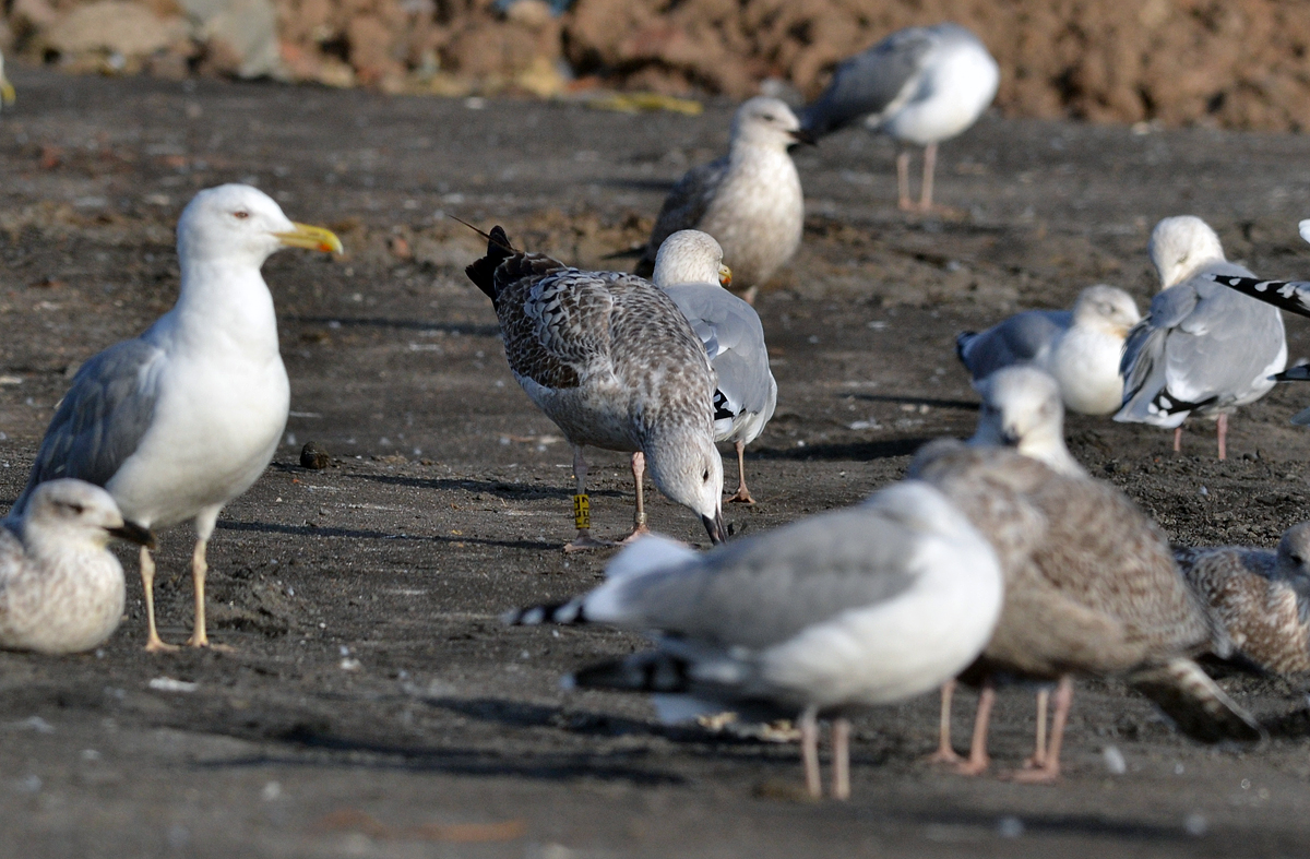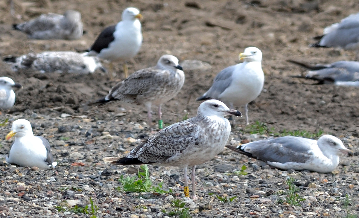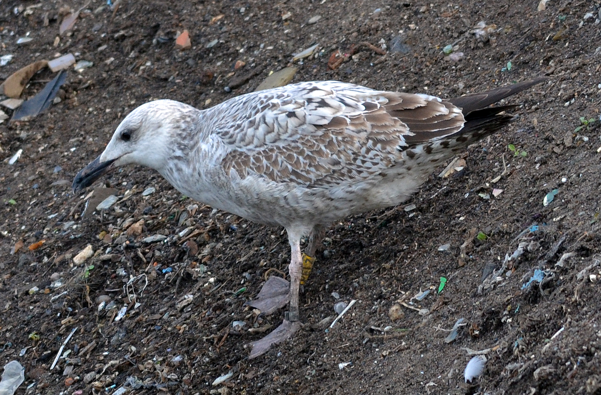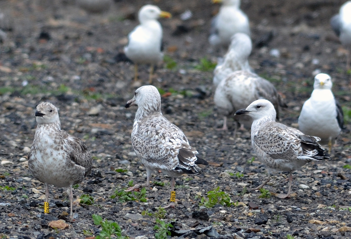 Larus cachinnans 1CY-2CY PELZ September-October 2011 & August 2012, Deponie Pohlsche Heide - Minden, Germany (52°23'05N, 08°46'45E). Picture: Armin Deutsch. Yellow PELZ and metal PLG DN-26994; ringed as pullus on May 24 2011 at Zwirownia Zakole A, Jankowice - Babice, Poland (50,02N 19,28E). Zwirownia = gravel pit, this colony is situated between the towns of Babice and Jankowice in a gravel pit. Recoveries:
