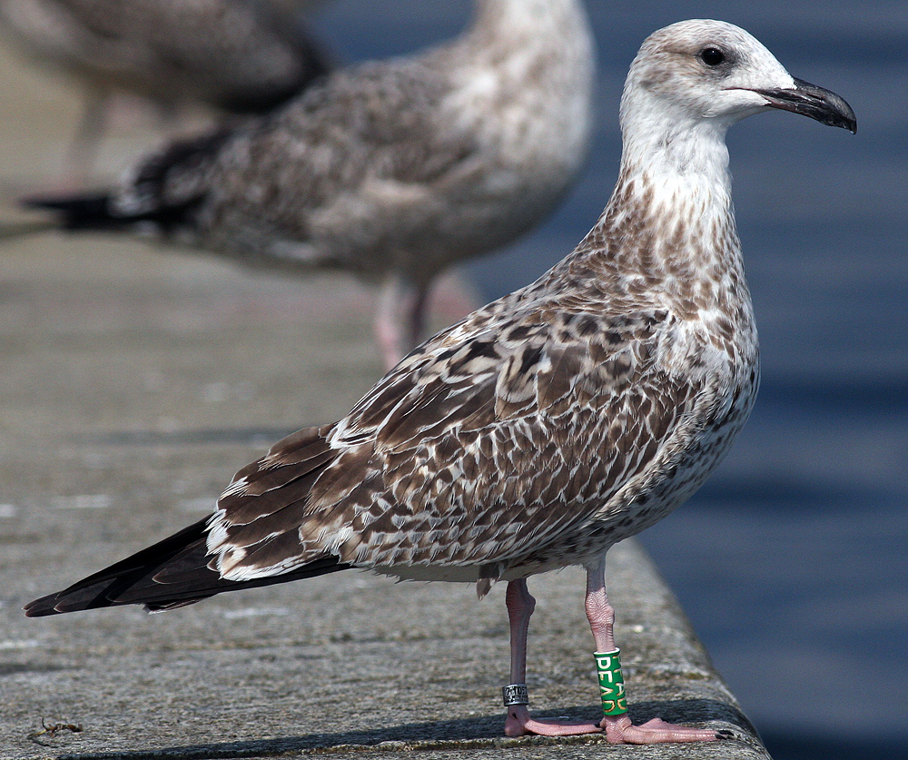 Larus michahellis 1CY PFAD September 18 2008, Ares beach - A Coruña, NW Spain. Picture: Antonio Gutierrez. Ringing data: PFAD green ringed as chick at Delta del Ebro, Tarragona on 18 June 2008. |