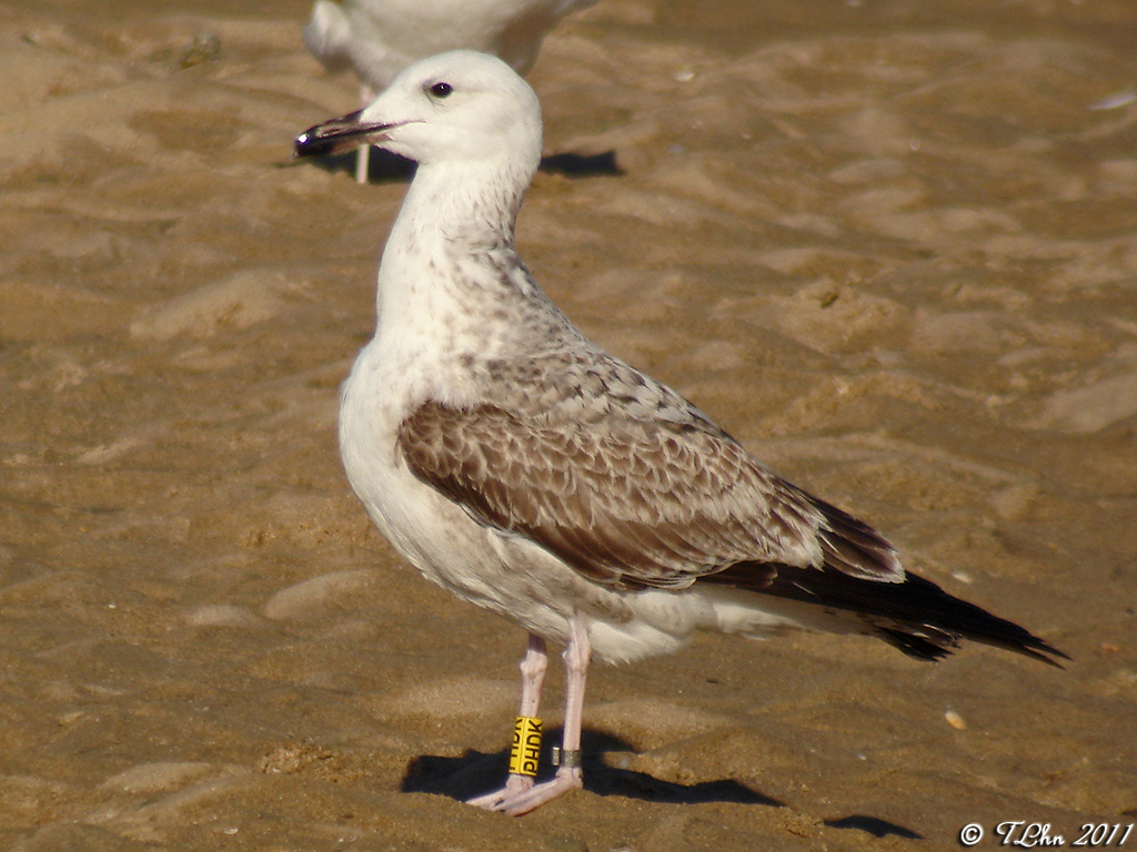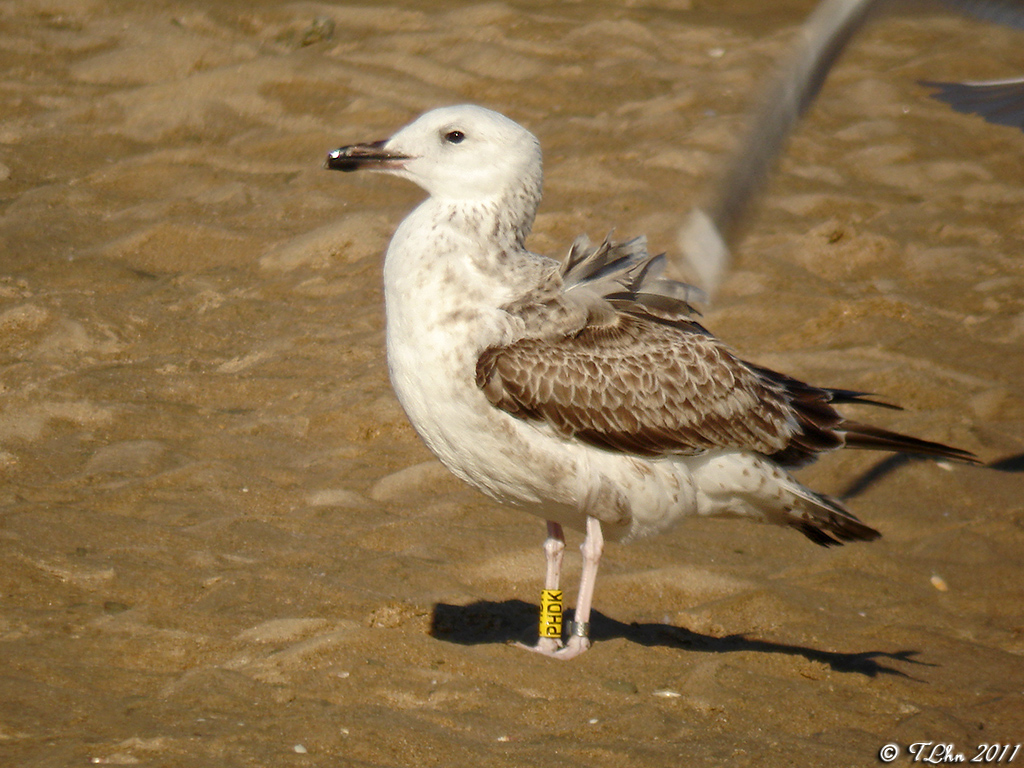 Larus cachinnans 1cy PHDK November 19 2011, Normandy, France. Picture: Tony Le Huu Nghia. Visit Tony's site! Bird ringed yellow PHDK; ringed as pullus on May 24 2011 at Zwirownia Zakole A, Jankowice - Babice, Poland (50,02N 19,28E). Zwirownia = gravel pit, this colony is situated between the towns of Babice and Jankowice in a gravel pit. Scapulars replaced, but wing-coverts and tertials still juvenile. |