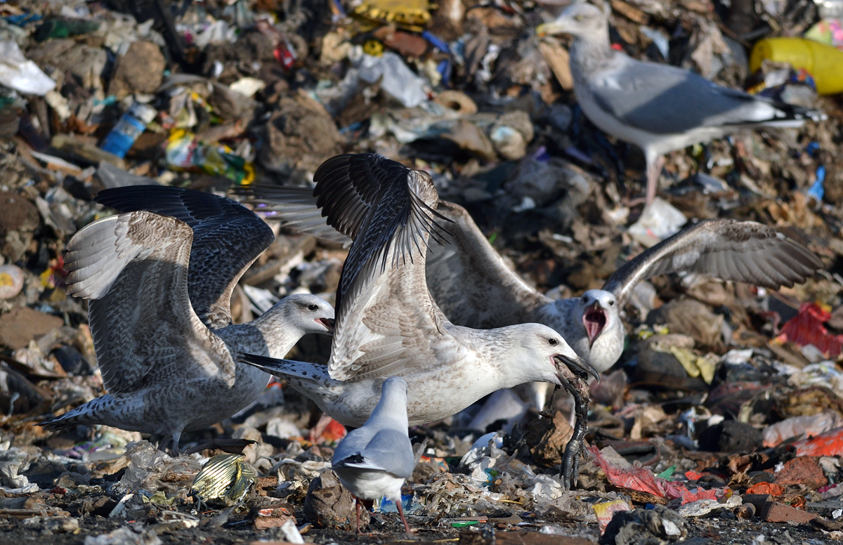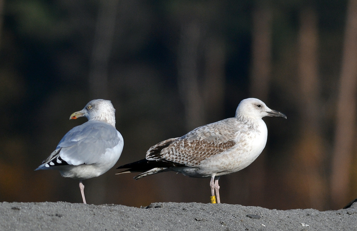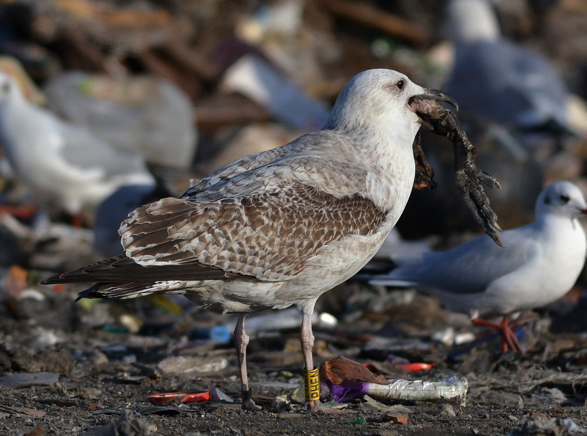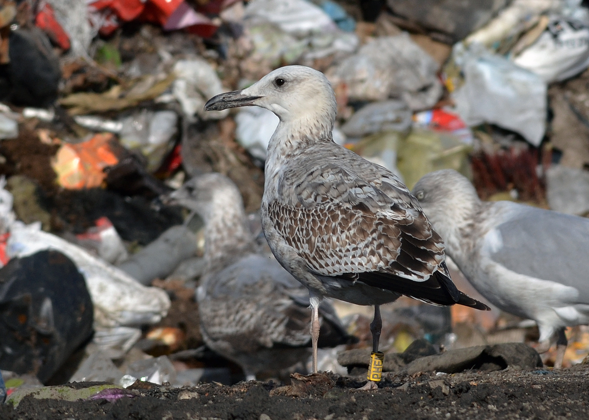Larus cachinnans 1CY PHEN October & November 2011, Deponie Pohlsche Heide - Minden, Germany (52°23'05N, 08°46'45E). Picture: Armin Deutsch. Yellow PHEN and metal PLG DN-27210; ringed as pullus on May 24 2011 at Zwirownia Zakole A, Jankowice - Babice, Poland (50,02N 19,28E). Zwirownia = gravel pit, this colony is situated between the towns of Babice and Jankowice in a gravel pit. Recoveries:
