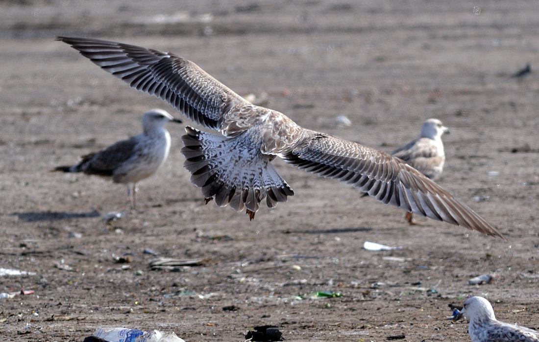 In this area are mixed breeding colonies (near Katowice), with far most birds breeding here are cachinnans, but in this area also records of very few michahellis from the south (e.g. ringed female from Italy) and argentatus from eastern Germany are possible (see PDF). PKSD is classic cachinnans. below cachinnans 1CY PKSD August 02 2012, Deponie Pohlsche Heide - Minden, Germany (52°23'05N, 08°46'45E). Picture: Armin Deutsch. Bird in juvenile plumage. below cachinnans 1CY PKSD August 09 2012, Deponie Pohlsche Heide - Minden, Germany (52°23'05N, 08°46'45E). Picture: Armin Deutsch. Classic tail pattern and nice venetian blind effect (dark outerwebs and pale innerwebs on inner primaries). below cachinnans 1CY PKSD October 04 2012, Deponie Pohlsche Heide - Minden, Germany (52°23'05N, 08°46'45E). Picture: Armin Deutsch. All scapulars and several inner wing-coverts replaced in post-juvenile moult. below cachinnans 1CY PKSD June 28 2013, Lembruch-Dümmer, Germany (52°31'N, 08°21'E). Picture: Armin Deutsch. Bird in complete moult: P1-P4 fully grown, P8-P10 old juvenile. Moult gap in central GC, exposing old juvenile secondaries underneath. |