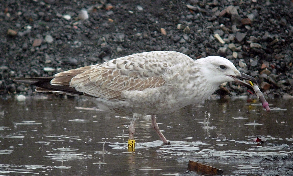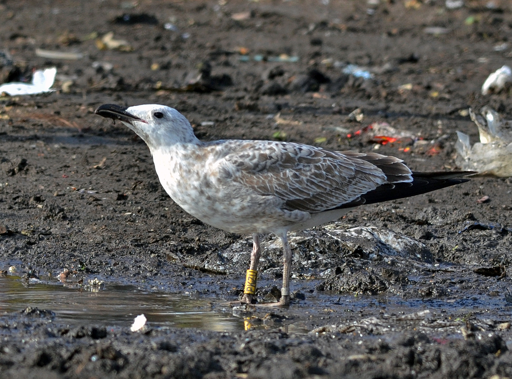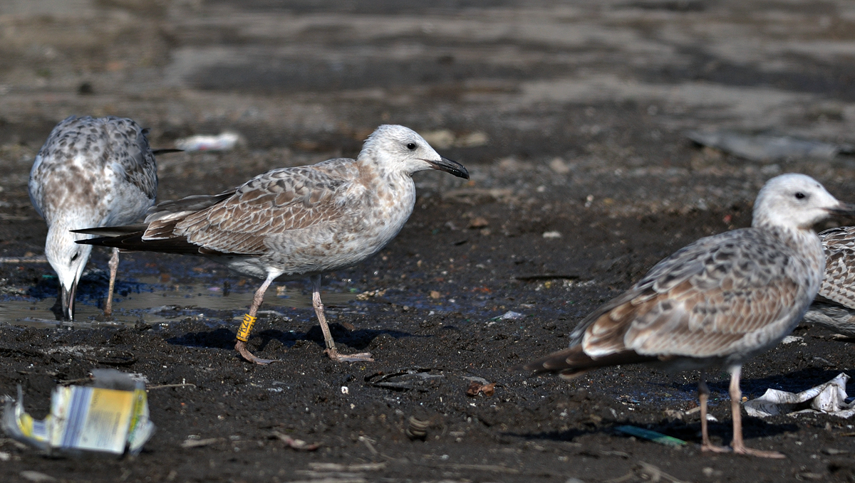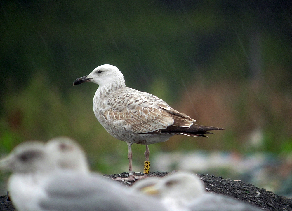 Larus cachinnans 1CY PKZU September 12 - October 04 2012, Deponie Pohlsche Heide - Minden, Germany (52°23'05N, 08°46'45E). Picture: Armin Deutsch. Yellow PKZU and metal PLG DN-28792; ringed as pullus on May 25 2012 at Kozielno, Paczkow, S-SW Poland, (50°28' N, 16°58' E). Recoveries: