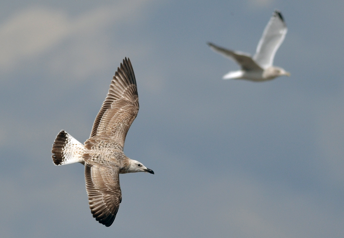 In this area are mixed breeding colonies (near Katowice), with far most birds breeding here are cachinnans, but in this area also records of very few michahellis from the south (e.g. ringed female from Italy) and argentatus from eastern Germany are possible (see PDF). PKZU is classic cachinnans. below: cachinnans 1CY PKZU September 12 2012, Deponie Pohlsche Heide - Minden, Germany (52°23'05N, 08°46'45E). Picture: Armin Deutsch. Most upper scapulars replaced, lowest row of scapulars still juvenile with simple pale fringe, no notching. Single wing-coverts replaced in post-juvenile moult as well. Tertials juvenile. Much patterning on underwing, classic view in flying bird from above. below: cachinnans 1CY PKZU October 04 2012, Deponie Pohlsche Heide - Minden, Germany (52°23'05N, 08°46'45E). Picture: Armin Deutsch. Single coverts replaced in left wing. |