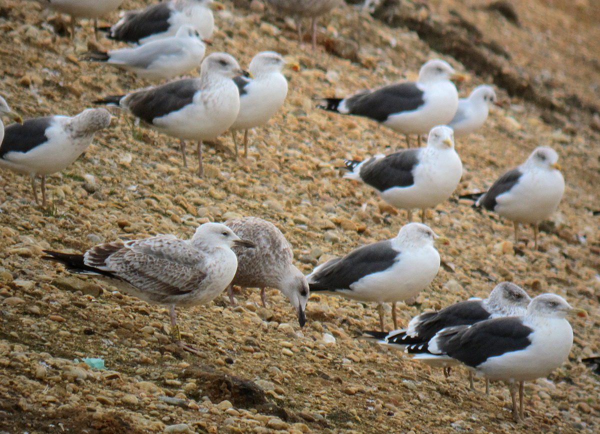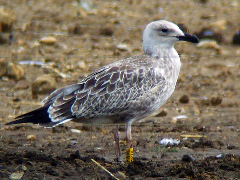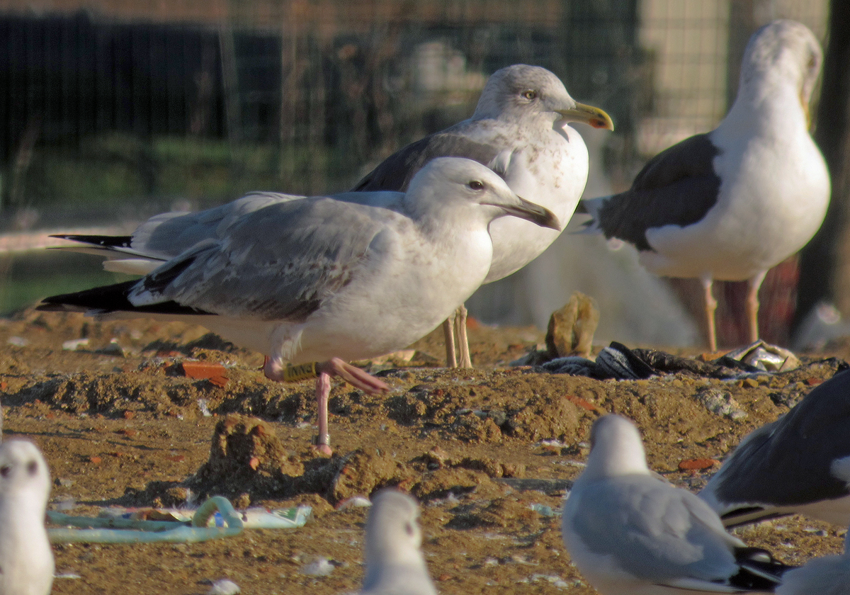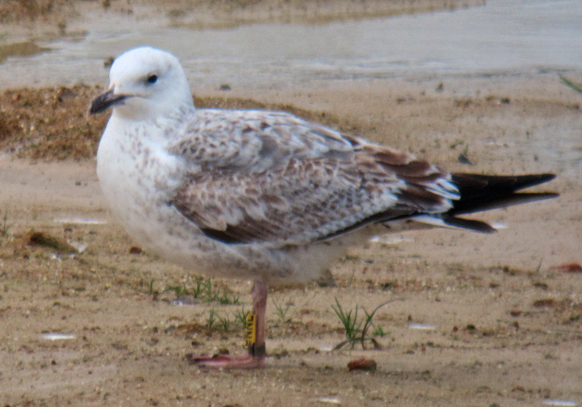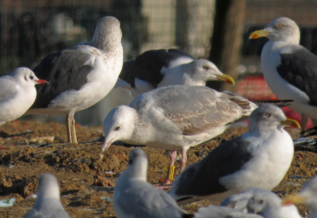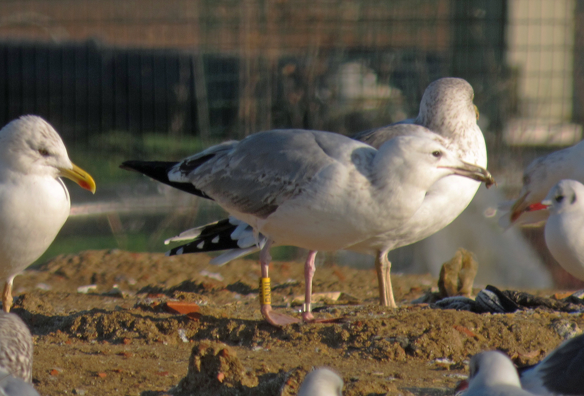 Larus cachinnans 1CY-2CY PNNL August 2013-December 2014, England, Netherlands and France. Picture: Lee Gregory, Alain Fossé & PieterGeert Gelderblom. Yellow PNNL, ringed as pullus on May 24 2013 at Kozielno, Paczkow, S-SW Poland, (50°28' N, 16°58' E). See also Alain's site: HERE. below: cachinnans 2CY PNNL December 30 2014, CET La Séguinière, France. Picture: Alain Fossé. Travelled 1364 km. Now in 2nd cycle plumage with many grey scaps and grey MC band. Also replaced inner GC and upper TT in partial moult.