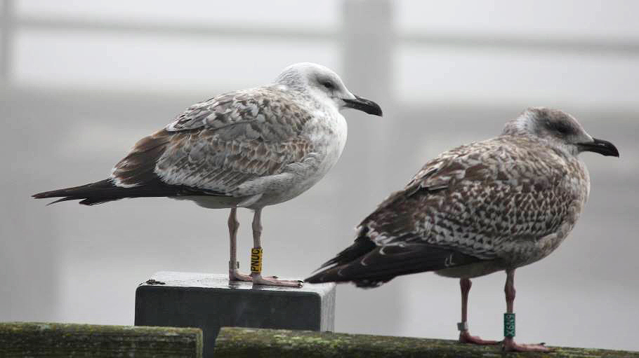 Larus cachinnans 1CY PNUC November 15 2013, Warnemünde, Germany. Picture: Bernhard Kondziella. Bird ringed yellow PNUC, probably ringed as pullus on May 24 2013 at Kozielno, Paczkow, S-SW Poland, (50°28' N, 16°58' E). Local Herring from Germany Green X6N9 and Polish Caspian Gull. Several wing-coverts included in post-juvenile moult. |