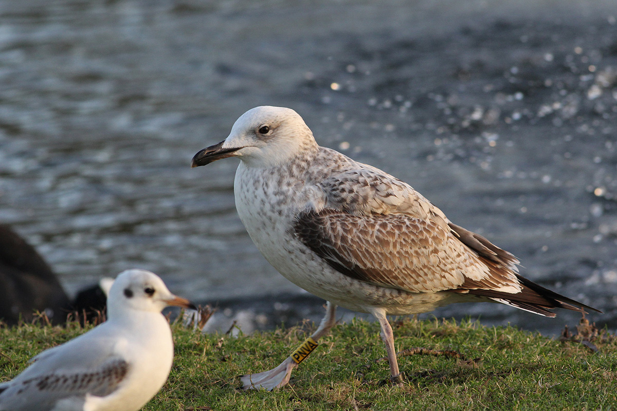 Larus cachinnans PNVA 1CY-2CY, December 2013 - April 2014, Dordrecht, the Netherlands. Picture: Merijn Loeve. Bird ringed yellow PNVA, probably ringed as pullus on May 24 2013 at Kozielno, Paczkow, S-SW Poland, (50°28' N, 16°58' E). below: Larus cachinnans 1CY PNVA December 20 2013, Dordrecht, the Netherlands. Picture: Merijn Loeve. Classic bird.