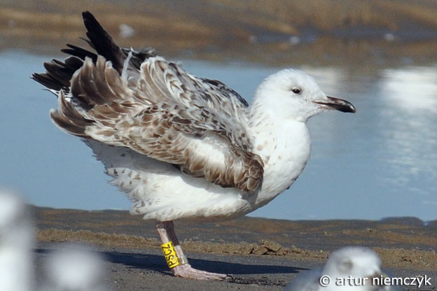 Larus cachinnans 1CY PSCZ October 17 2011, Krynica Morska, Poland. Picture: Artur Niemczyk. Yellow PSCZ, ringed as pullus on June 10 2011 at Cherkasy Kreminchuk reservoir, Ukraine (49.4N 32.15). Classic bird from Ukraine. |