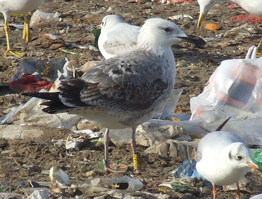 Larus cachinnans 1CY PUAC December 05 2010, Jakuševec-Zagreb, Croatia. Picture: ringing team Luka Jurinovic. Read at Zagreb landfill, from Ukraine: ringed as pullus on June 05 2010 at Kreminchukske Reservoir, Cherkasi in Ukraine. No coverts or tertials replaced in post-juvenile moult. |